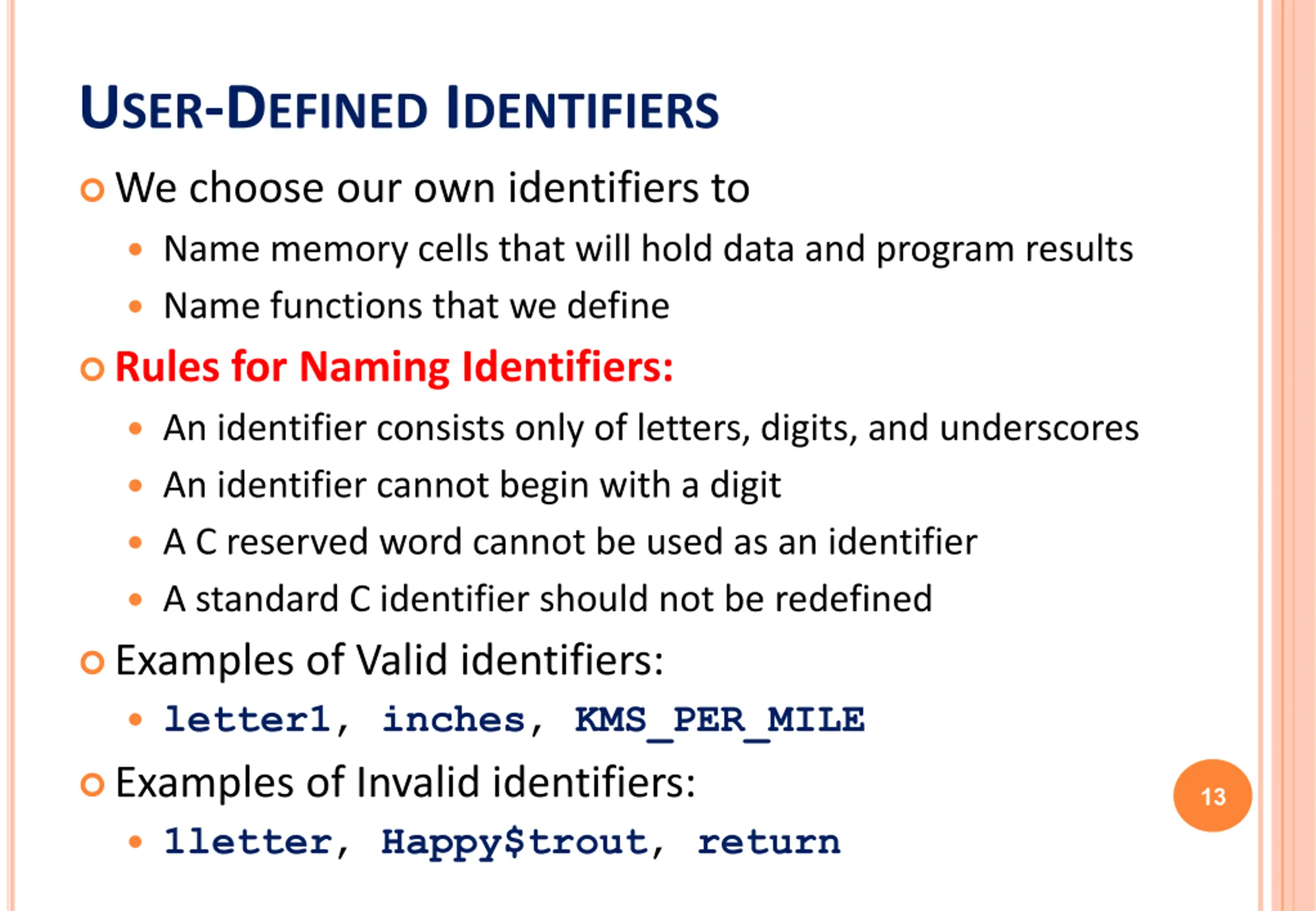 USER-DEFINED IDENTIFIERS We choose our own identifiers to Name memory cells that will hold data and program results Name functions that we define Rules for Naming Identifiers: An identifier consists only of letters, digits, and underscores An identifier cannot begin with a digit A C reserved word cannot be used as an identifier A standard C identifier should not be redefined Examples of Valid identifiers: letter1, inches, KMS_PER_MILE Examples of Invalid identifiers: 1letter, Happy$trout, return 13