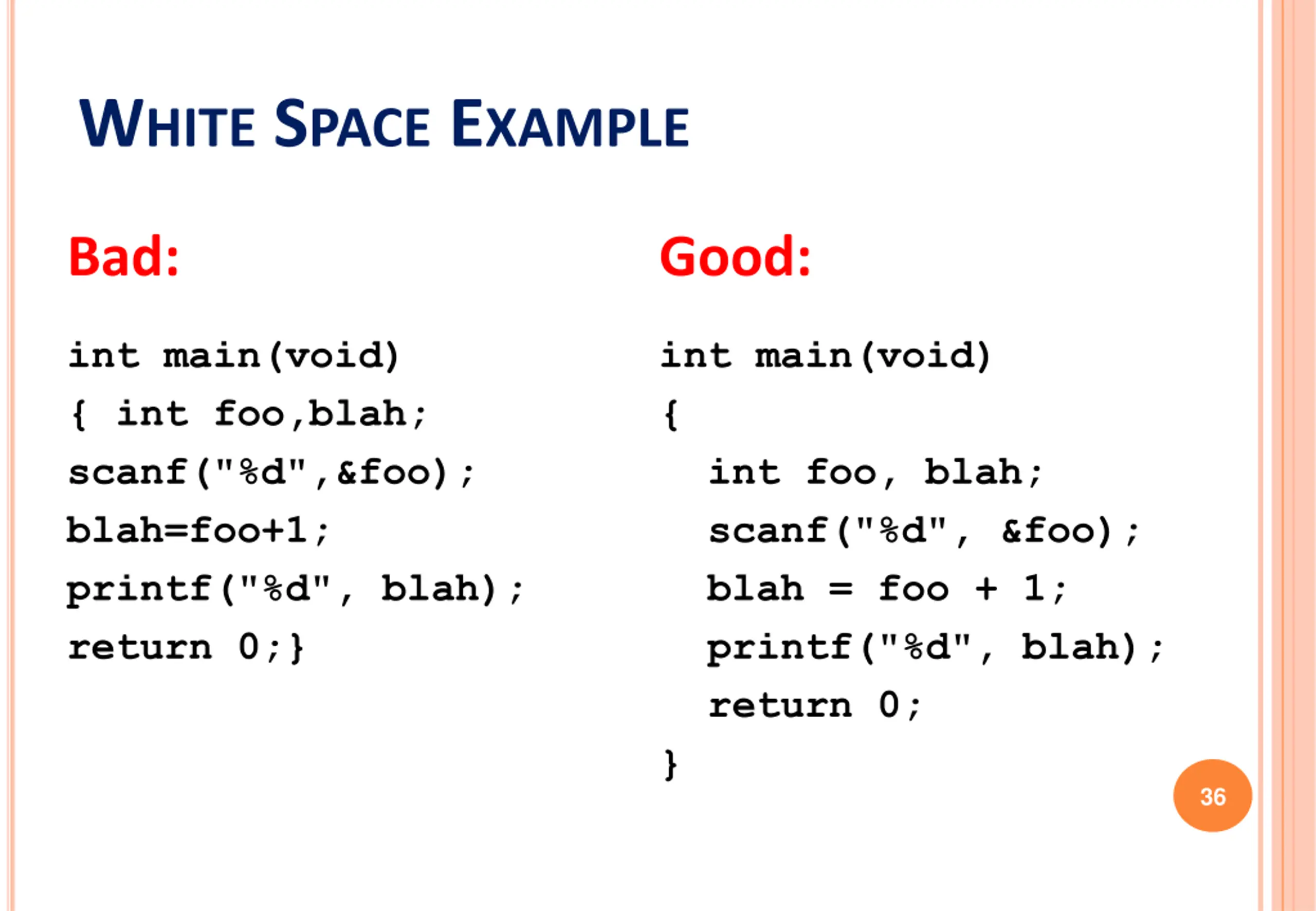 WHITE SPACE EXAMPLE Bad: Good: int main(void) { int foo,blah; scanf("%d",&foo); blah=foo+1; printf("%d", blah); return 0;} int main(void) { int foo, blah; scanf("%d", &foo); blah = foo + 1; printf("%d", blah); return 0; } 36