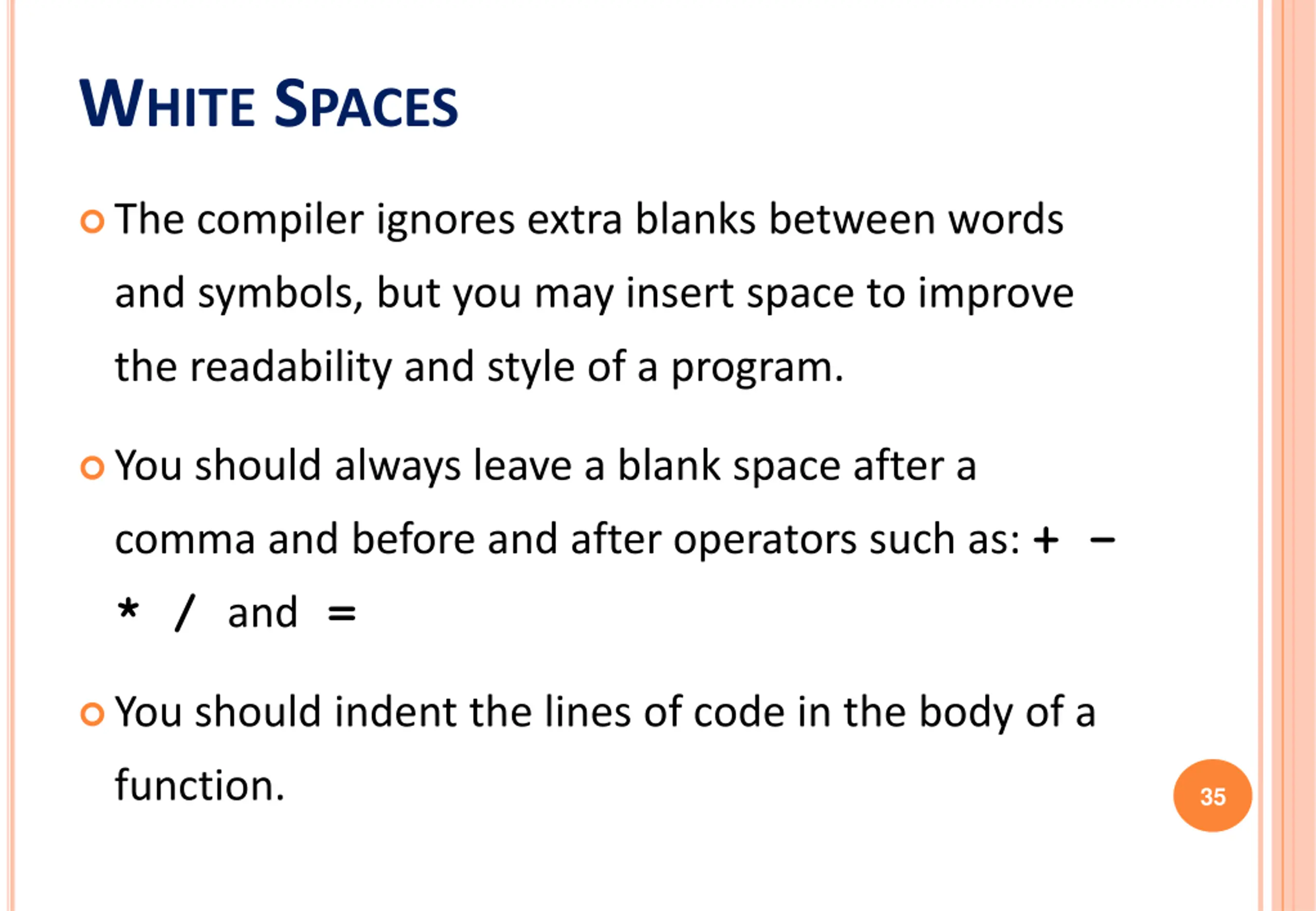 WHITE SPACES The compiler ignores extra blanks between words and symbols, but you may insert space to improve the readability and style of a program. You should always leave a blank space after a comma and before and after operators such as: + * / and = You should indent the lines of code in the body of a function. 35