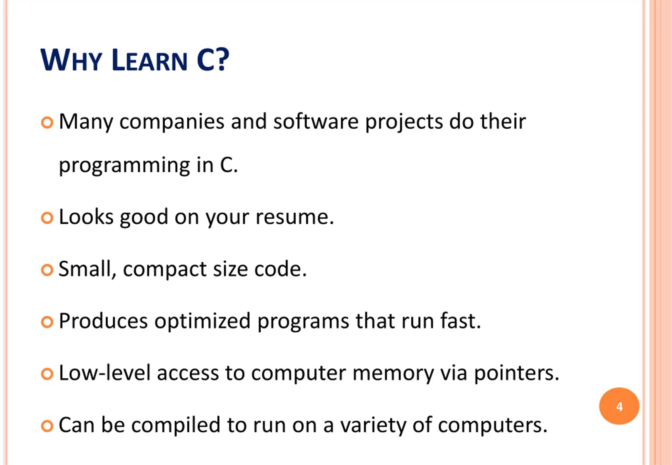 WHY LEARN C? Many companies and software projects do their programming in C. Looks good on your resume. Small, compact size code. Produces optimized programs that run fast. Low-level access to computer memory via pointers. 4 Can be compiled to run on a variety of computers.