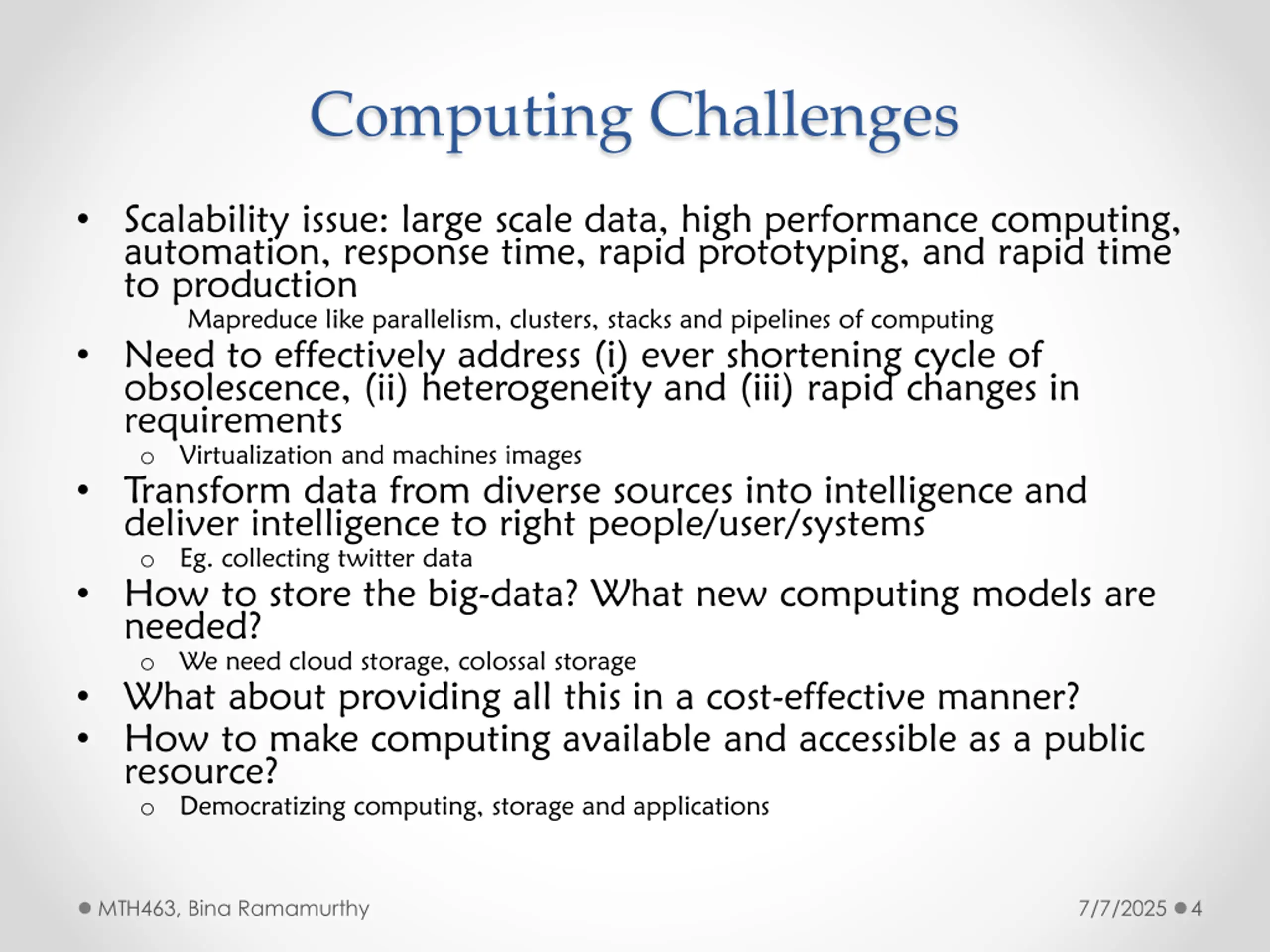 Computing Challenges Scalability issue: large scale data, high performance computing, automation, response time, rapid prototyping, and rapid time to production Mapreduce like parallelism, clusters, stacks and pipelines of computing Need to effectively address (i) ever shortening cycle of obsolescence, (ii) heterogeneity and (iii) rapid changes in requirements o Virtualization and machines images Transform data from diverse sources into intelligence and deliver intelligence to right people/user/systems o Eg. collecting twitter data How to store the big-data? What new computing models are needed? o We need cloud storage, colossal storage What about providing all this in a cost-effective manner? How to make computing available and accessible as a public resource? o Democratizing computing, storage and applications MTH463, Bina Ramamurthy 7/7/2025 4