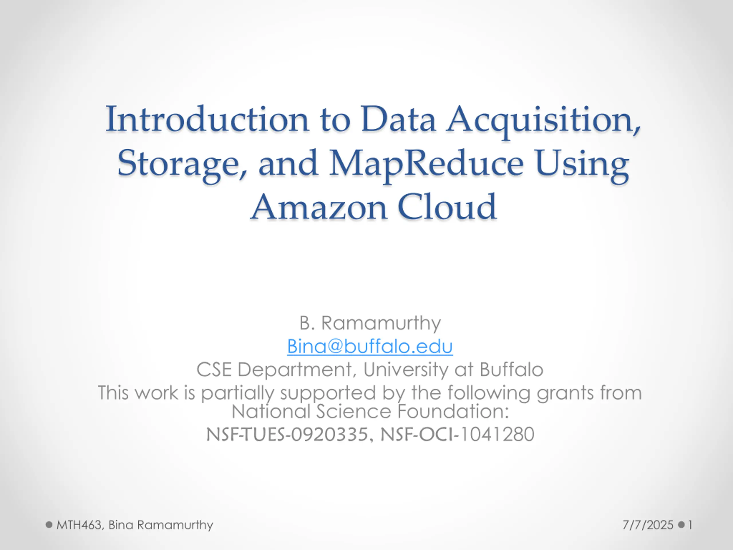 Introduction to Data Acquisition, Storage, and MapReduce Using Amazon Cloud B. Ramamurthy Bina@buffalo.edu CSE Department, University at Buffalo This work is partially supported by the following grants from National Science Foundation: NSF-TUES-0920335, NSF-OCI-1041280 MTH463, Bina Ramamurthy 7/7/2025 1