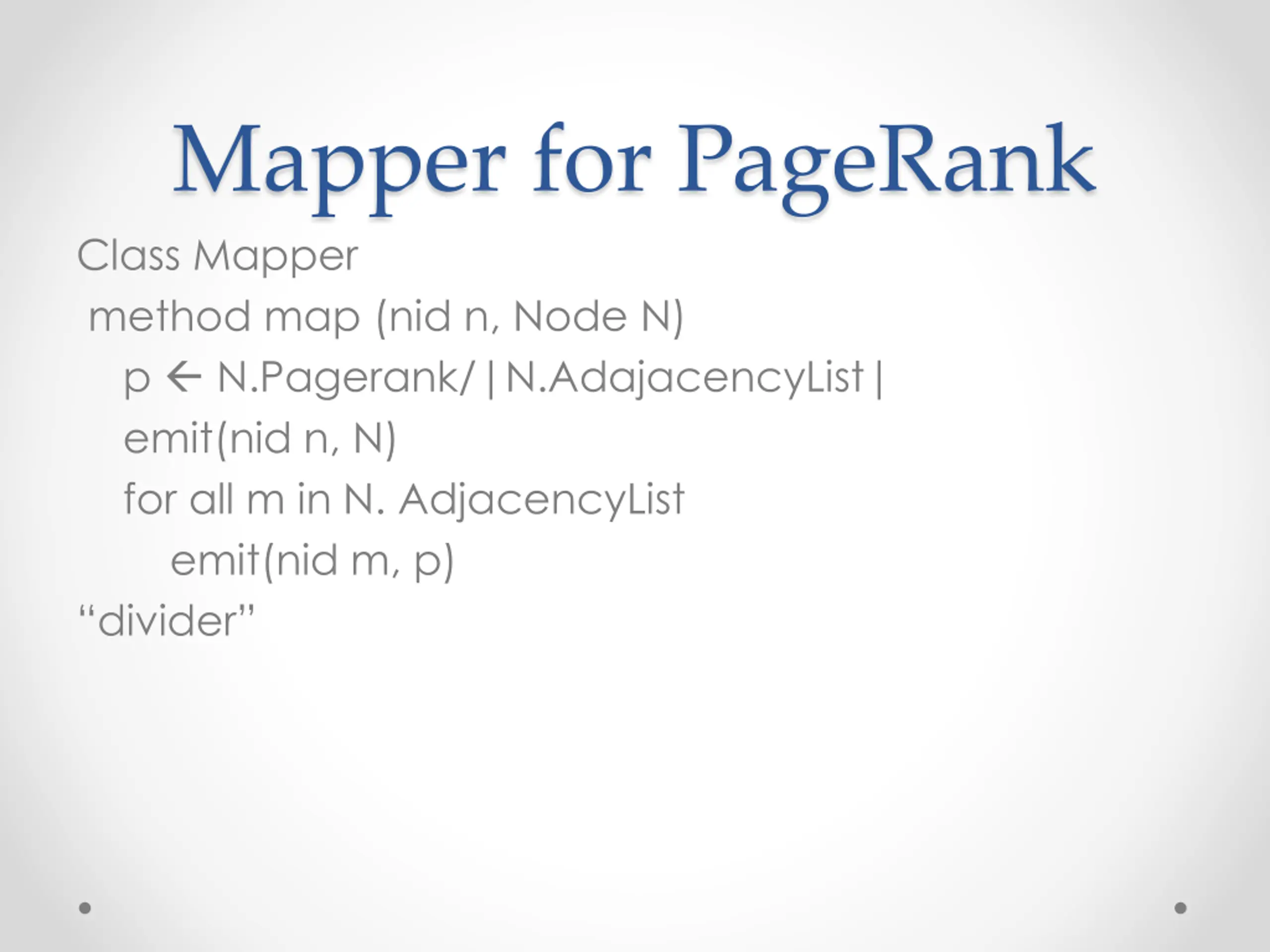 Mapper for PageRank Class Mapper method map (nid n, Node N) p N.Pagerank/|N.AdajacencyList| emit(nid n, N) for all m in N. AdjacencyList emit(nid m, p) divider