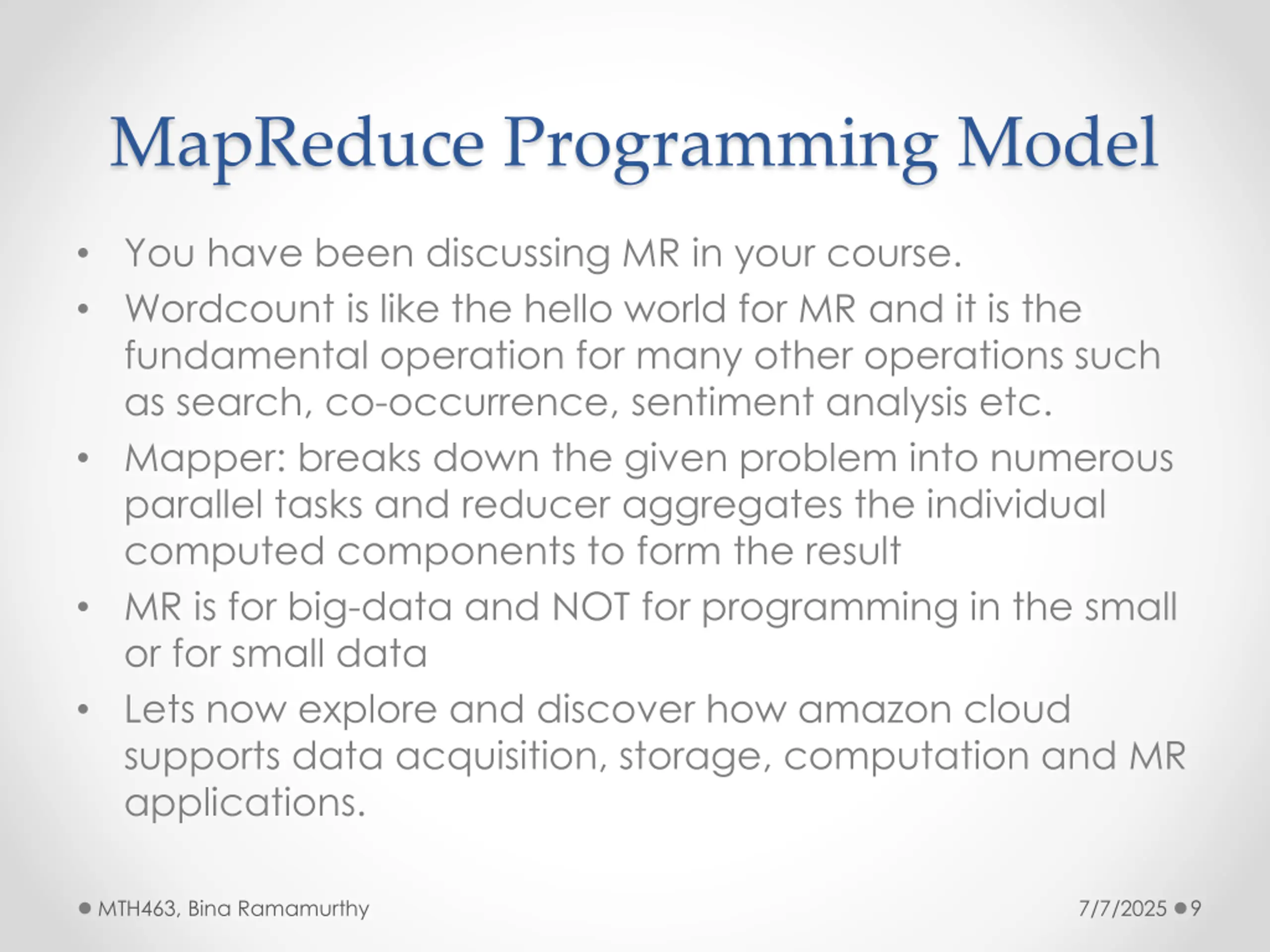 MapReduce Programming Model You have been discussing MR in your course. Wordcount is like the hello world for MR and it is the fundamental operation for many other operations such as search, co-occurrence, sentiment analysis etc. Mapper: breaks down the given problem into numerous parallel tasks and reducer aggregates the individual computed components to form the result MR is for big-data and NOT for programming in the small or for small data Lets now explore and discover how amazon cloud supports data acquisition, storage, computation and MR applications. MTH463, Bina Ramamurthy 7/7/2025 9