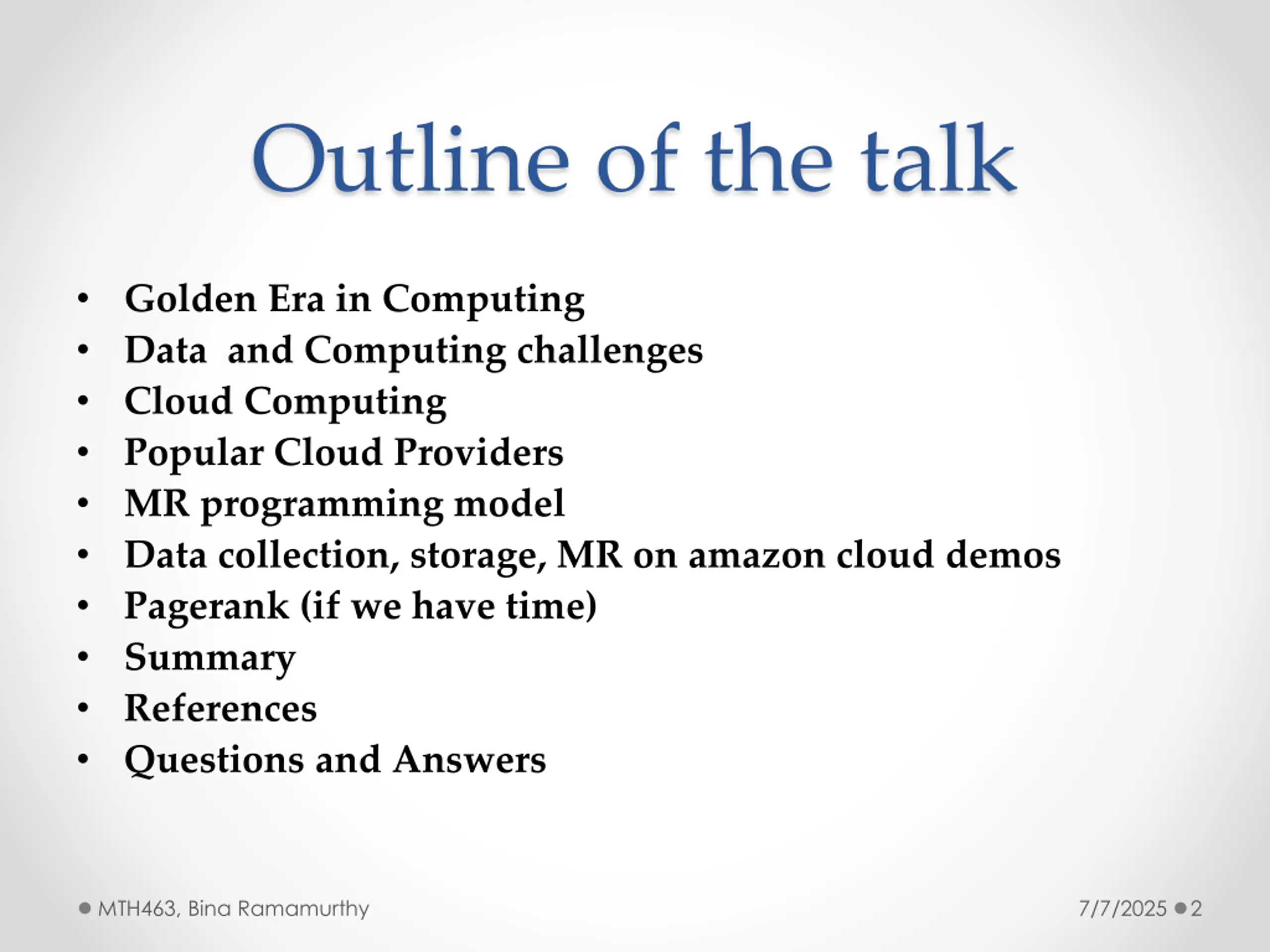 Outline of the talk Golden Era in Computing Data and Computing challenges Cloud Computing Popular Cloud Providers MR programming model Data collection, storage, MR on amazon cloud demos Pagerank (if we have time) Summary References Questions and Answers MTH463, Bina Ramamurthy 7/7/2025 2