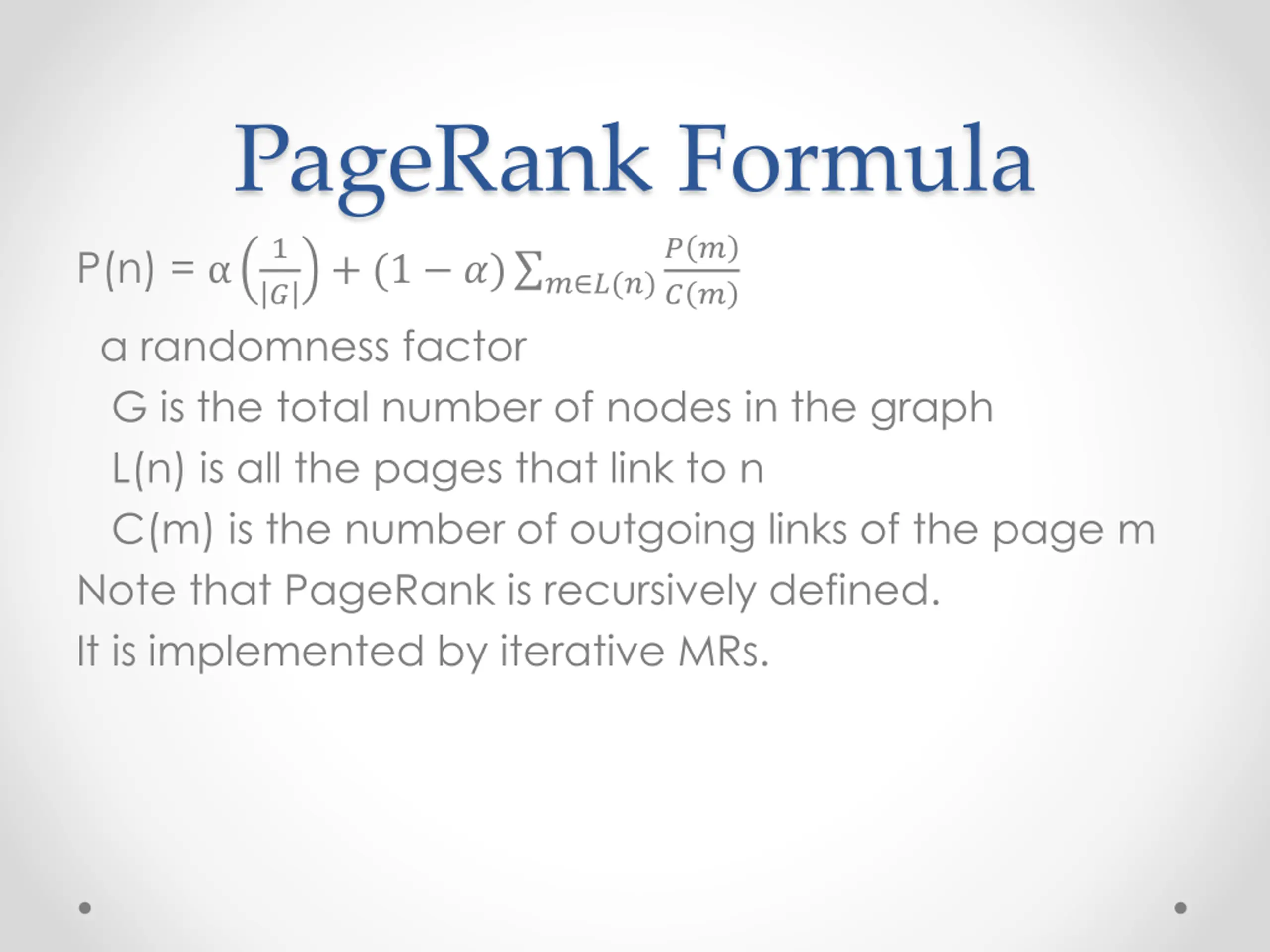 PageRank Formula 1 ? ? ? ? ? P(n) = + (1 ?) ? ?(?) randomness factor G is the total number of nodes in the graph L(n) is all the pages that link to n C(m) is the number of outgoing links of the page m Note that PageRank is recursively defined. It is implemented by iterative MRs.