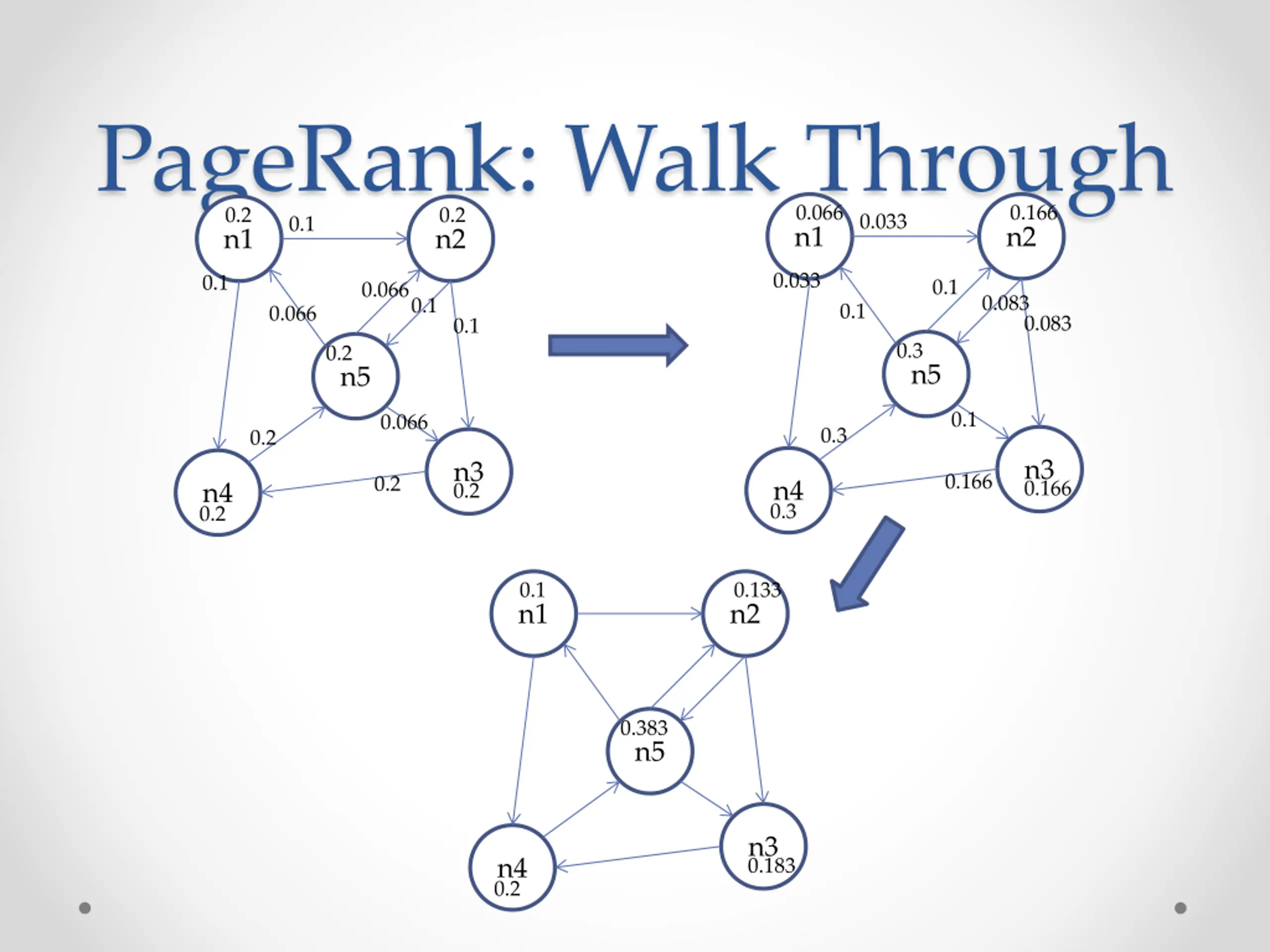 PageRank: Walk Through n1 n2 0.066 0.166 0.2 0.2 0.033 0.1 n1 n2 0.033 0.1 0.1 0.066 0.083 0.1 0.1 0.066 0.083 0.1 0.3 0.2 n5 n5 0.1 0.066 0.3 0.2 n3 0.166 n3 0.2 0.166 0.2 n4 0.3 n4 0.2 0.1 0.133 n1 n2 0.383 n5 n3 0.183 n4 0.2