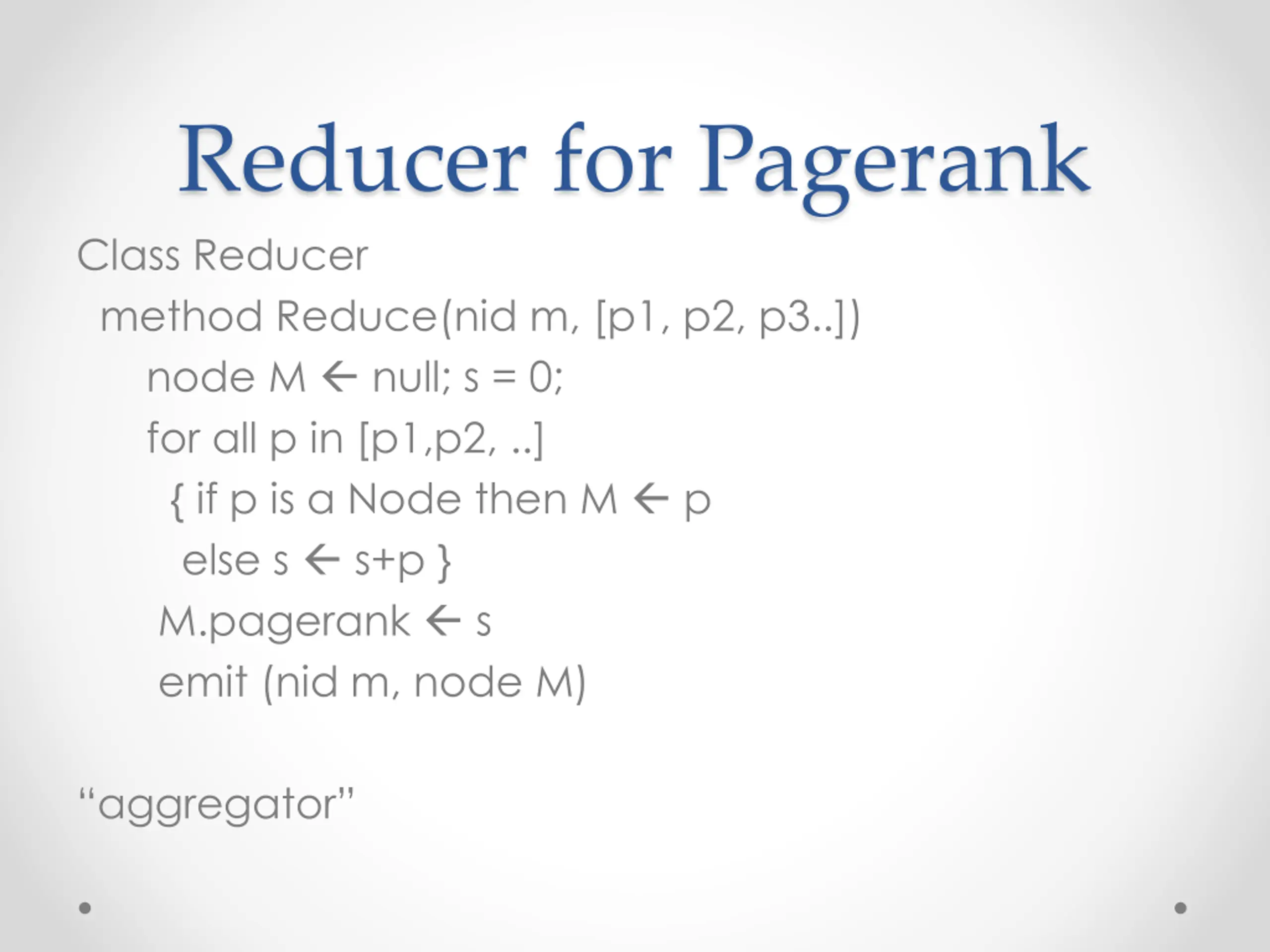 Reducer for Pagerank Class Reducer method Reduce(nid m, [p1, p2, p3..]) node M null; s = 0; for all p in [p1,p2, ..] { if p is a Node then M p else s s+p } M.pagerank s emit (nid m, node M) aggregator