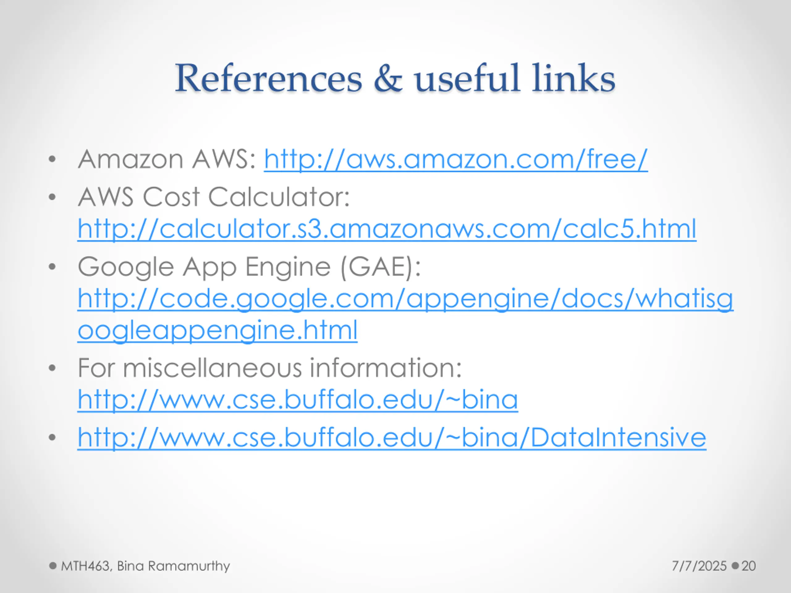 References & useful links Amazon AWS: http://aws.amazon.com/free/ AWS Cost Calculator: http://calculator.s3.amazonaws.com/calc5.html Google App Engine (GAE): http://code.google.com/appengine/docs/whatisg oogleappengine.html For miscellaneous information: http://www.cse.buffalo.edu/~bina http://www.cse.buffalo.edu/~bina/DataIntensive MTH463, Bina Ramamurthy 7/7/2025 20