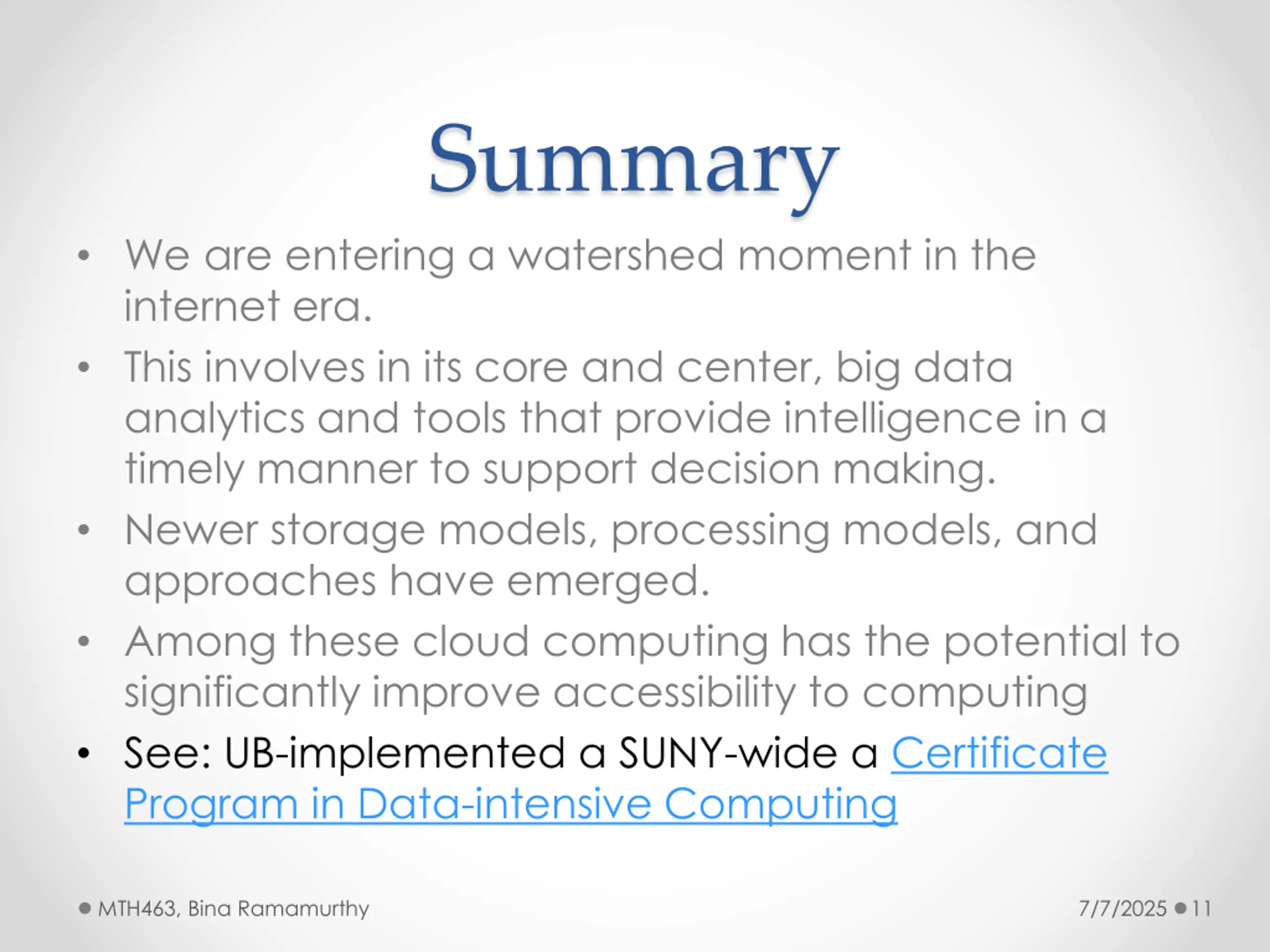 Summary We are entering a watershed moment in the internet era. This involves in its core and center, big data analytics and tools that provide intelligence in a timely manner to support decision making. Newer storage models, processing models, and approaches have emerged. Among these cloud computing has the potential to significantly improve accessibility to computing See: UB-implemented a SUNY-wide a Certificate Program in Data-intensive Computing MTH463, Bina Ramamurthy 7/7/2025 11