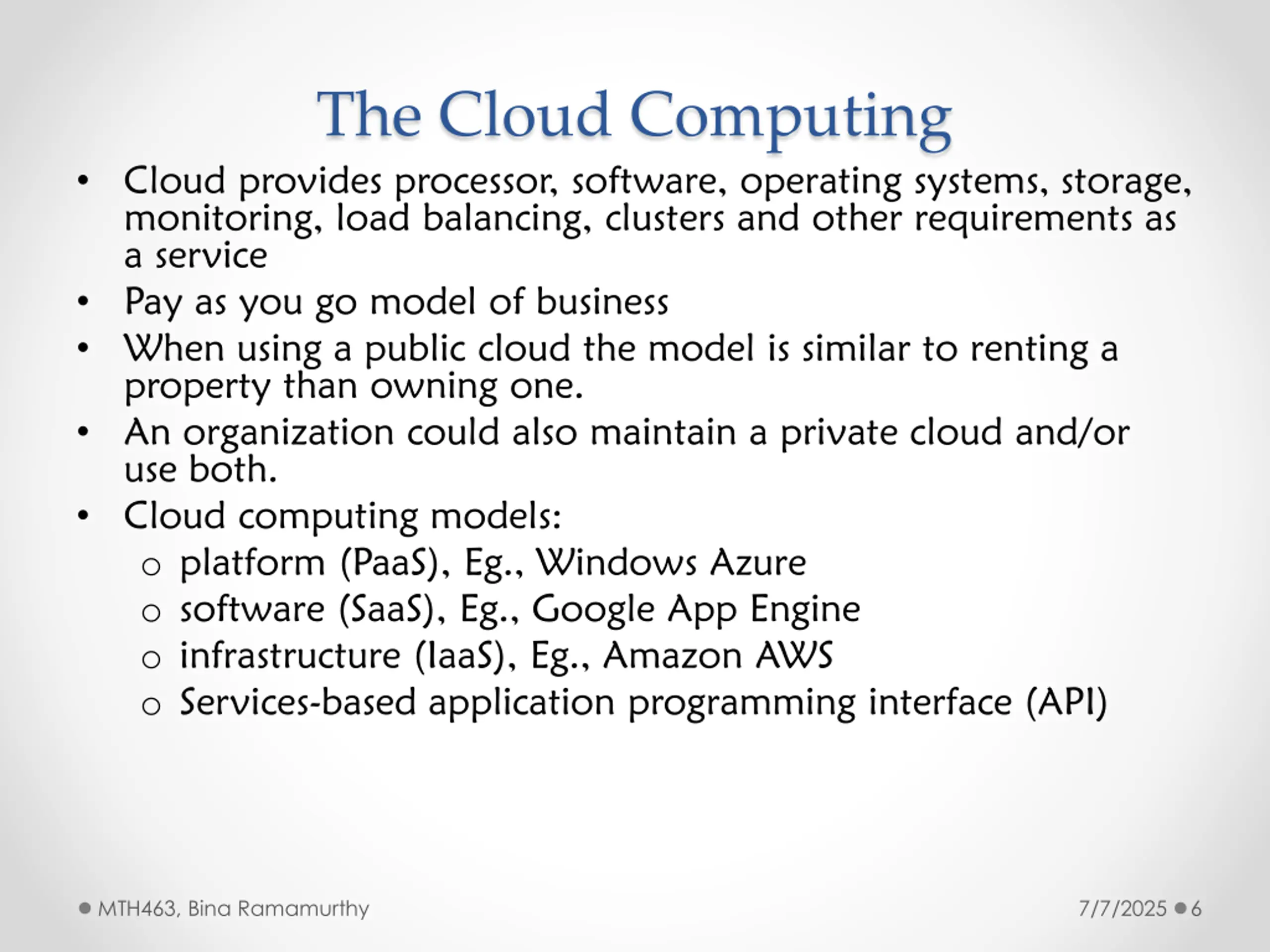 The Cloud Computing Cloud provides processor, software, operating systems, storage, monitoring, load balancing, clusters and other requirements as a service Pay as you go model of business When using a public cloud the model is similar to renting a property than owning one. An organization could also maintain a private cloud and/or use both. Cloud computing models: o platform (PaaS), Eg., Windows Azure o software (SaaS), Eg., Google App Engine o infrastructure (IaaS), Eg., Amazon AWS o Services-based application programming interface (API) MTH463, Bina Ramamurthy 7/7/2025 6