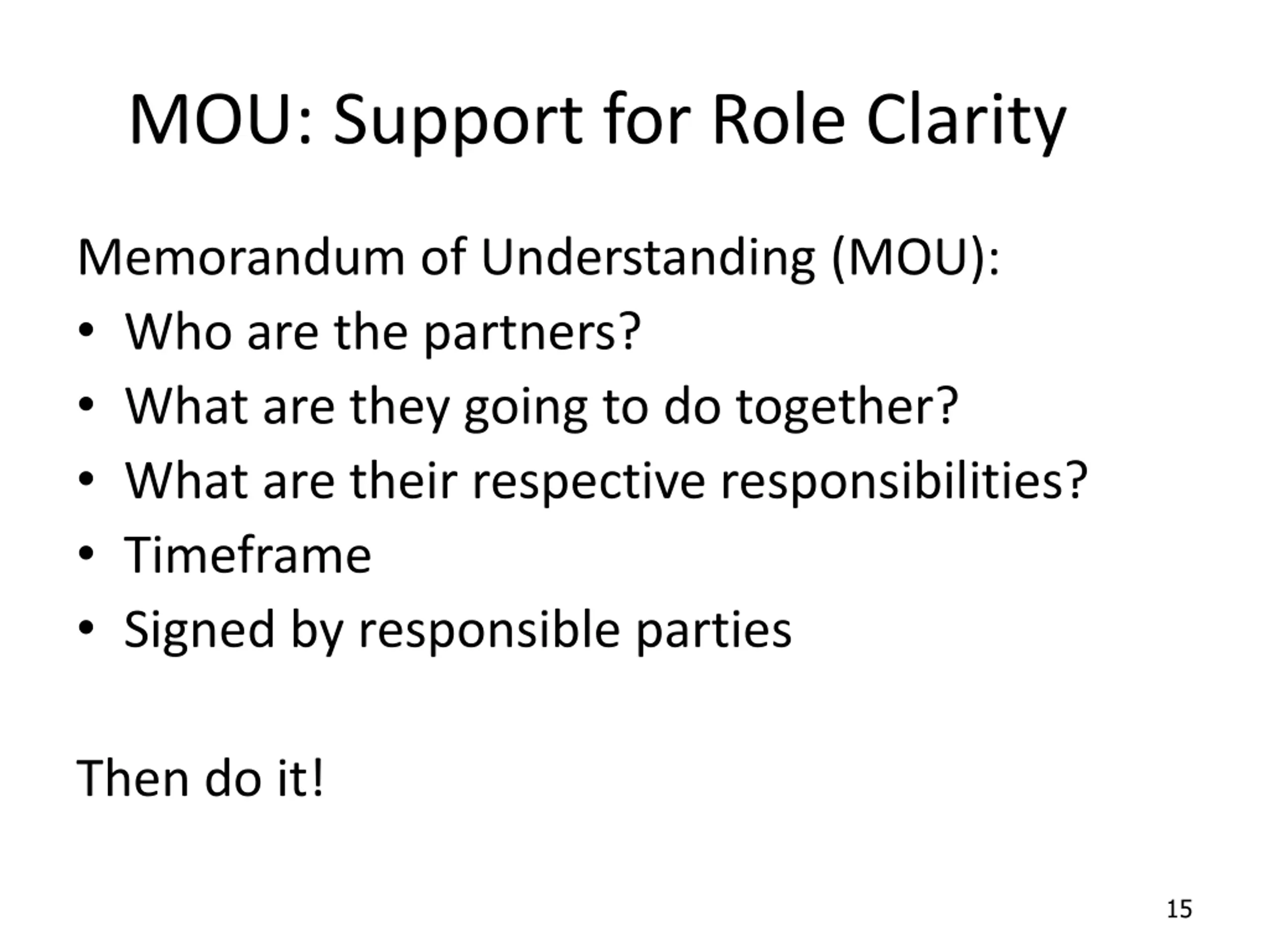 MOU: Support for Role Clarity Memorandum of Understanding (MOU): Who are the partners? What are they going to do together? What are their respective responsibilities? Timeframe Signed by responsible parties Then do it! 15