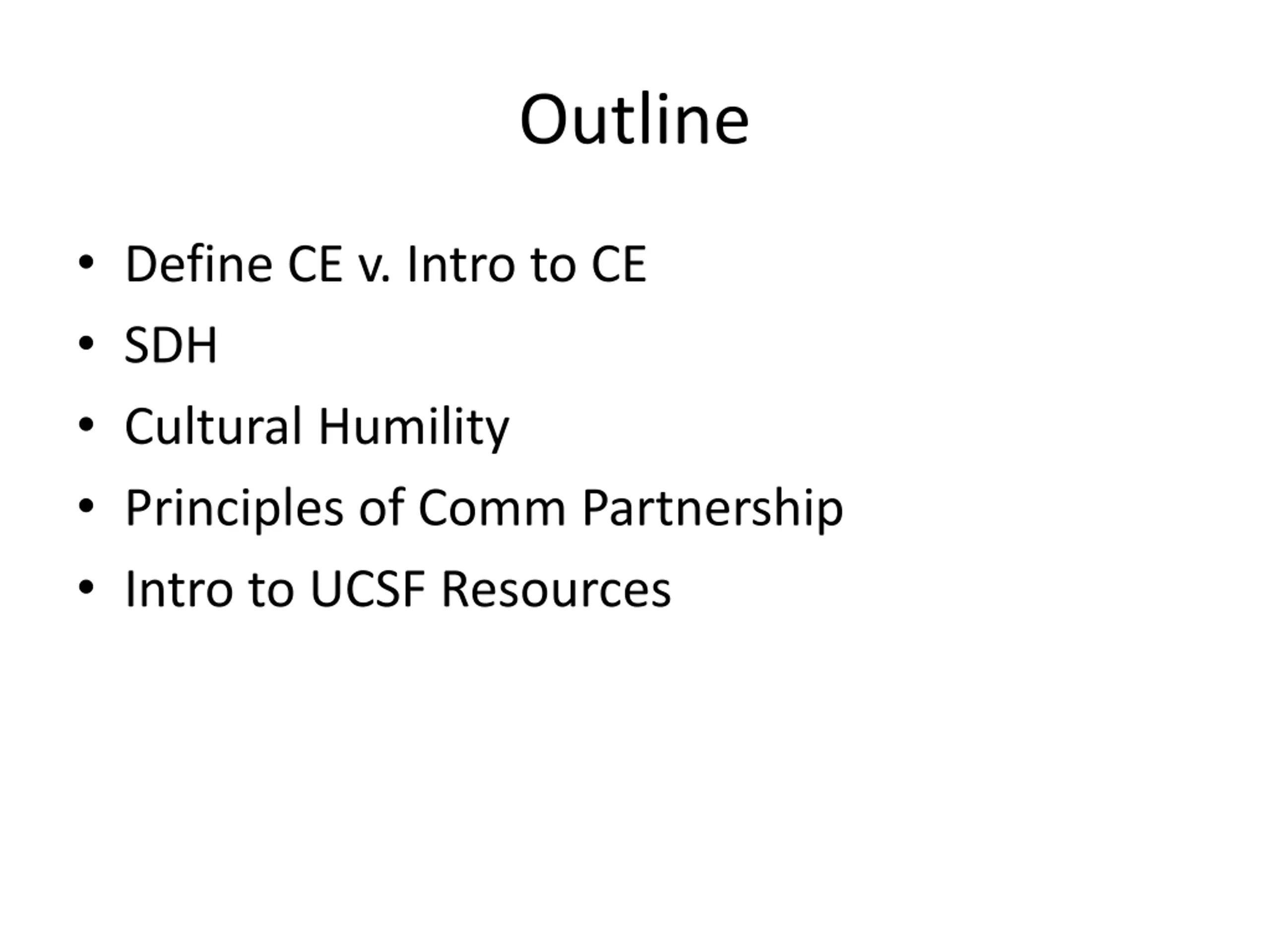 Outline Define CE v. Intro to CE SDH Cultural Humility Principles of Comm Partnership Intro to UCSF Resources