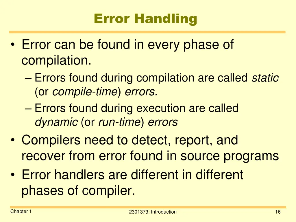 Error Handling Error can be found in every phase of compilation. Errors found during compilation are called static (or compile-time) errors. Errors found during execution are called dynamic (or run-time) errors Compilers need to detect, report, and recover from error found in source programs Error handlers are different in different phases of compiler. Chapter 1 2301373: Introduction 16