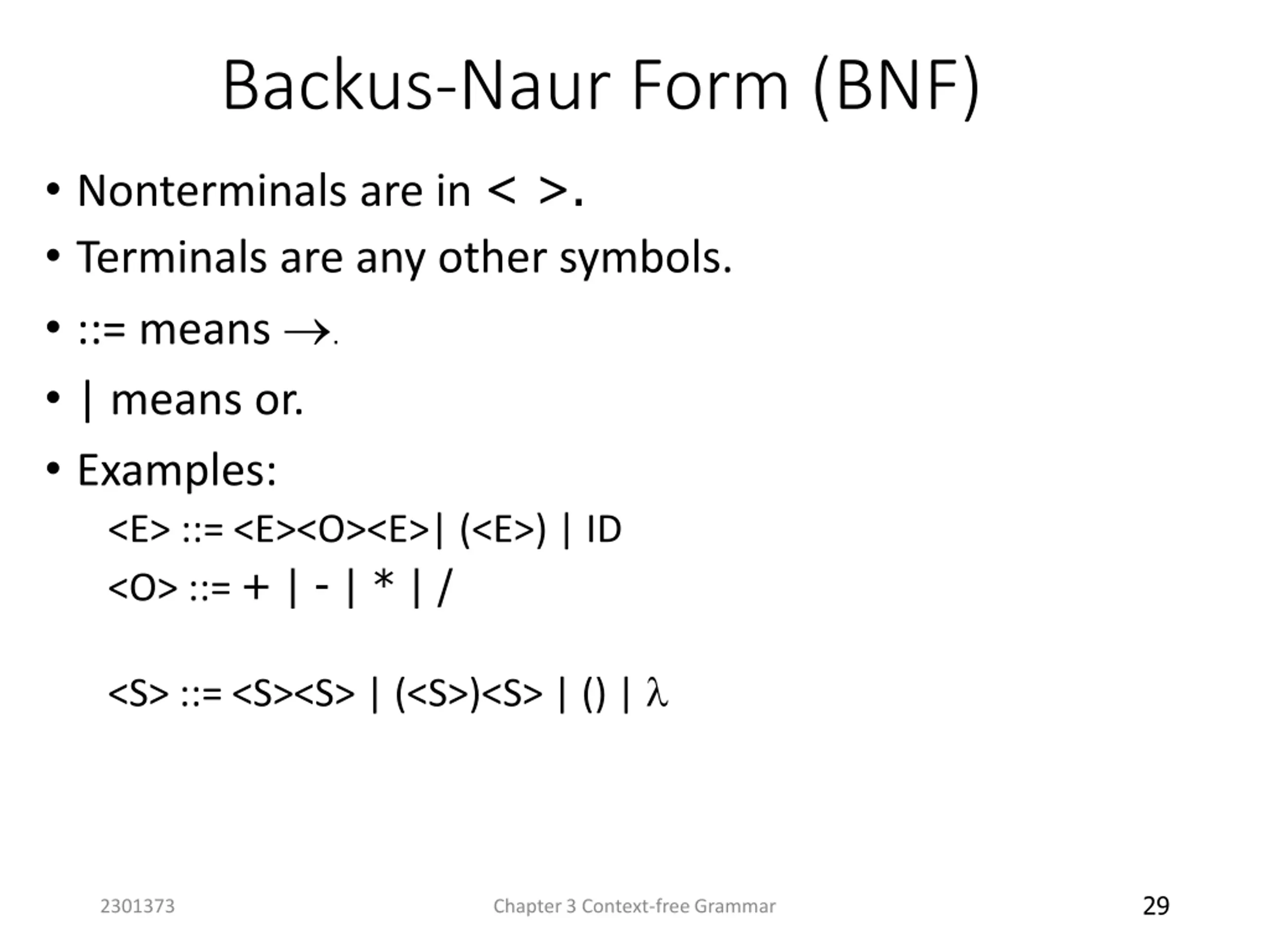 Backus-Naur Form (BNF) Nonterminals are in < >. Terminals are any other symbols. ::= means . | means or. Examples: <E> ::= <E><O><E>| (<E>) | ID <O> ::= + | - | * | / <S> ::= <S><S> | (<S>)<S> | () | 29 2301373 Chapter 3 Context-free Grammar