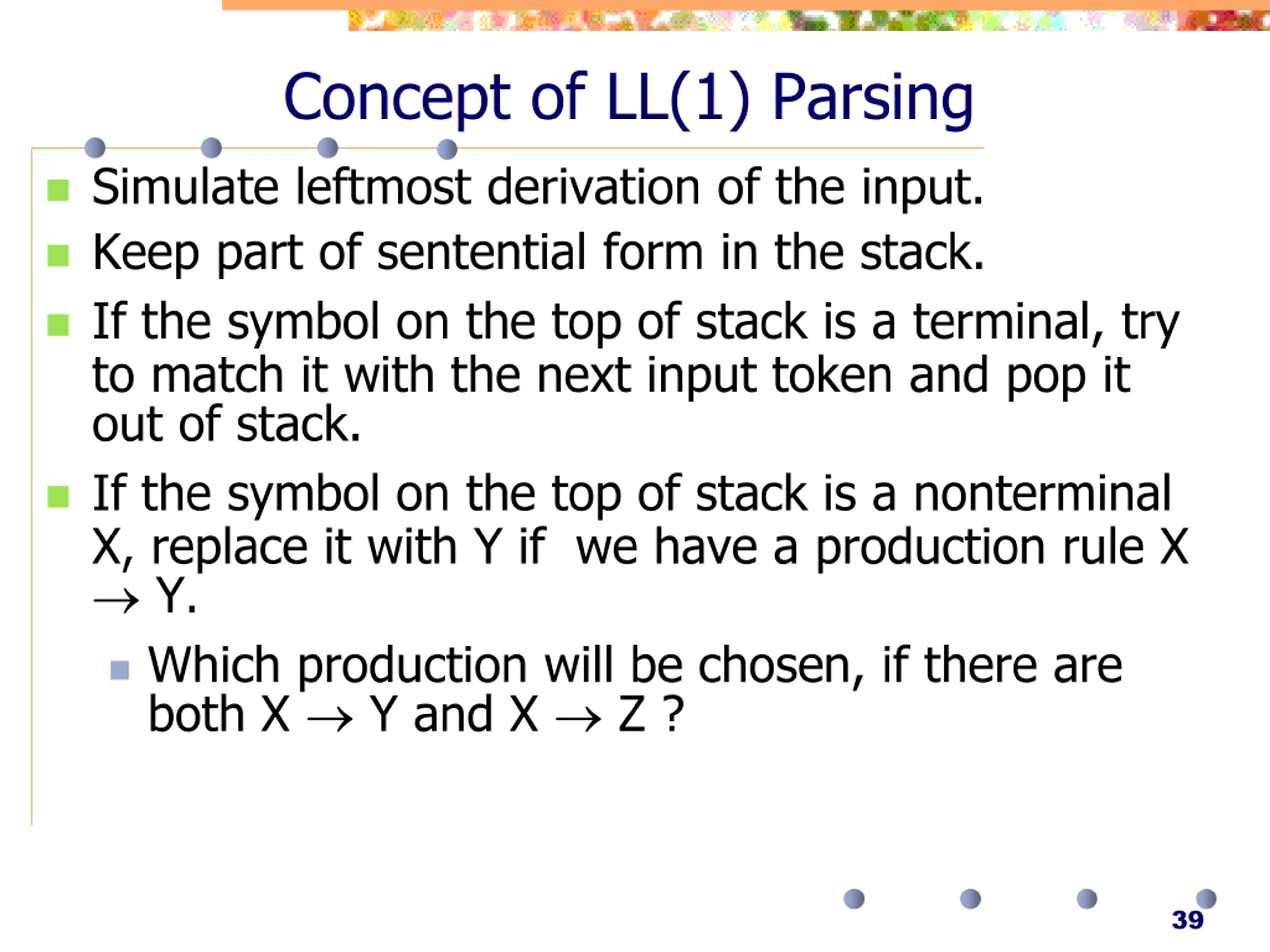 Concept of LL(1) Parsing Simulate leftmost derivation of the input. Keep part of sentential form in the stack. If the symbol on the top of stack is a terminal, try to match it with the next input token and pop it out of stack. If the symbol on the top of stack is a nonterminal X, replace it with Y if we have a production rule X Y. Which production will be chosen, if there are both X Y and X Z ? 39