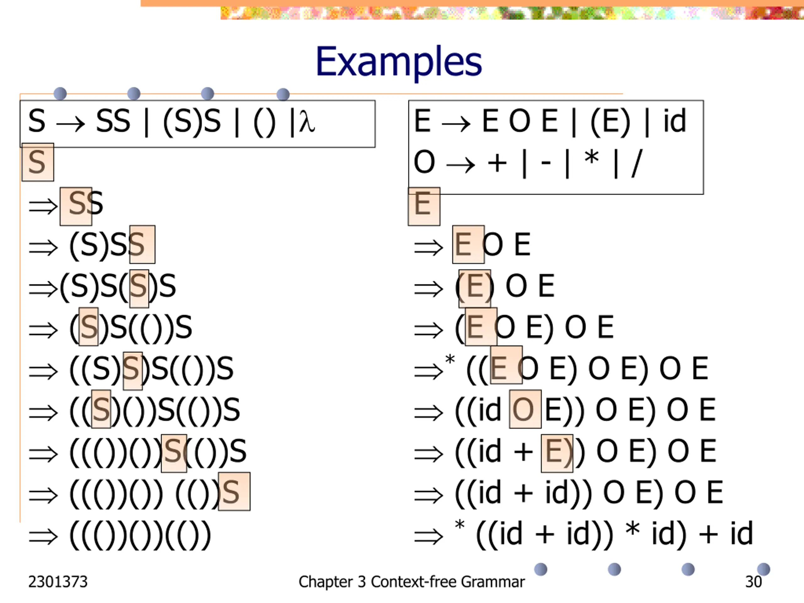 Examples S SS | (S)S | () | S SS (S)SS (S)S(S)S (S)S(())S ((S)S)S(())S ((S)())S(())S ((())())S(())S ((())()) (())S ((())())(()) E E O E | (E) | id O + | - | * | / E E O E (E) O E (E O E) O E *((E O E) O E) O E ((id O E)) O E) O E ((id + E)) O E) O E ((id + id)) O E) O E *((id + id)) * id) + id 2301373 Chapter 3 Context-free Grammar 30