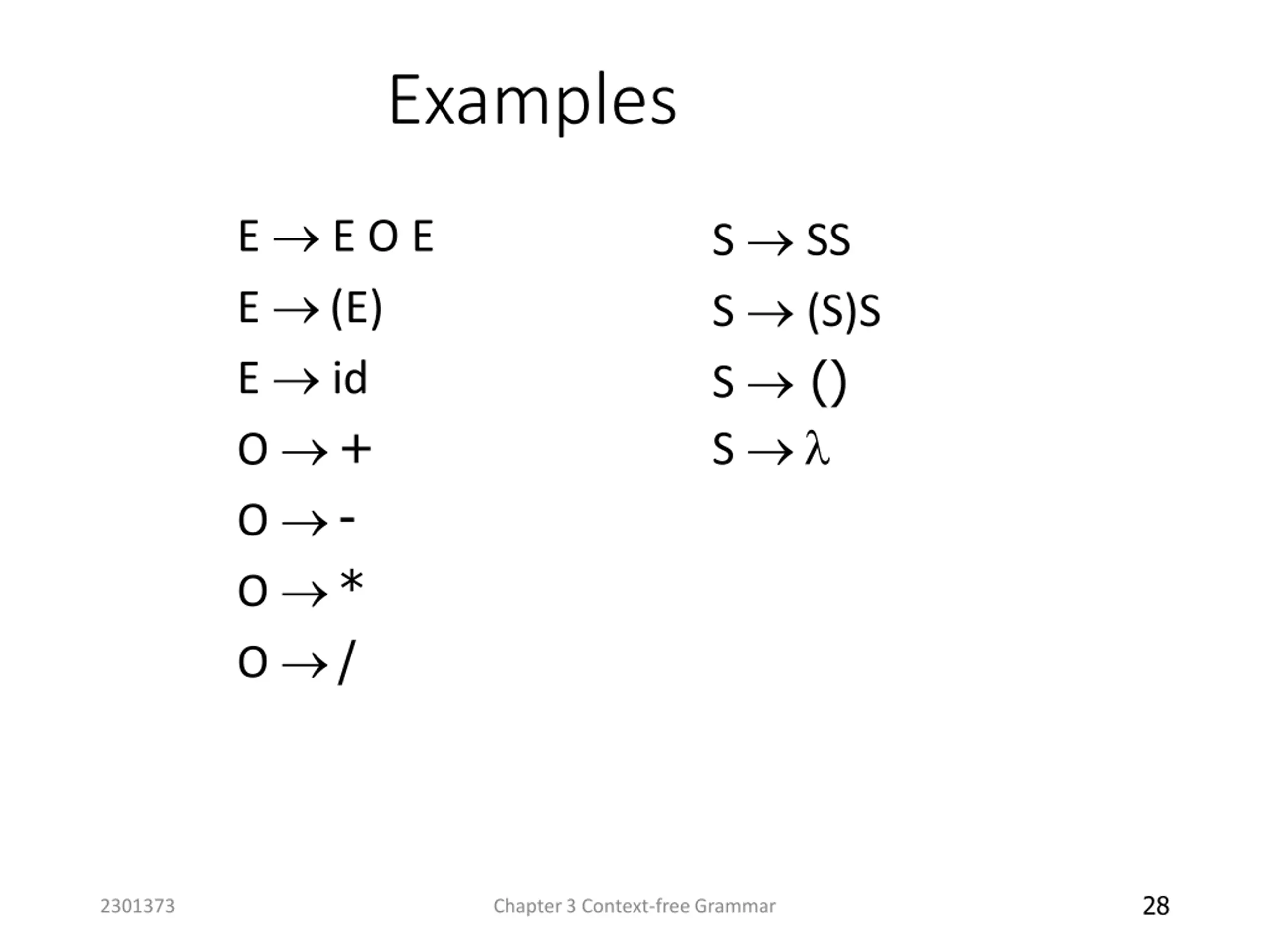 Examples E E O E E (E) E id O + O - O * O / S SS S (S)S S () S 28 2301373 Chapter 3 Context-free Grammar