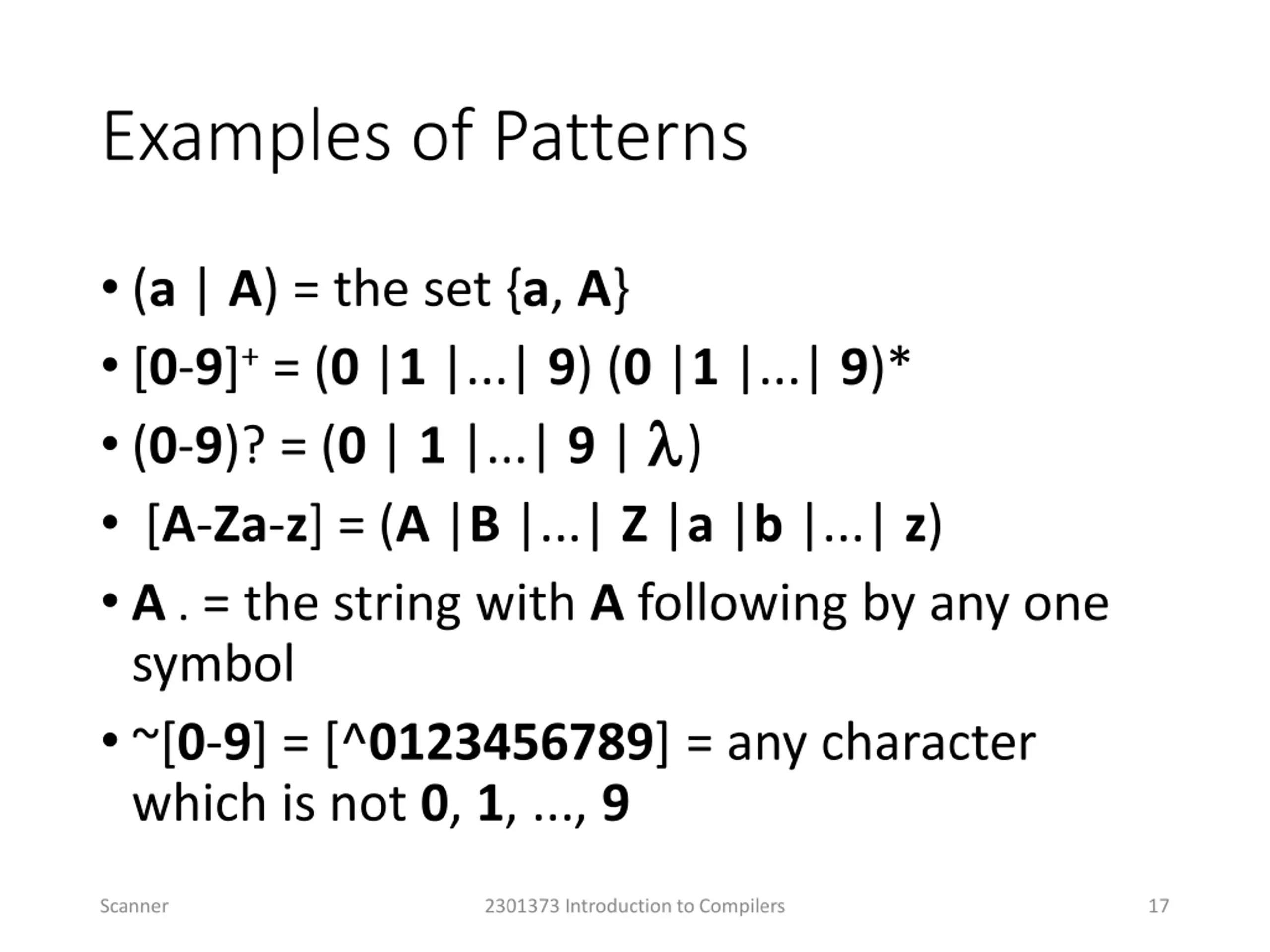 Examples of Patterns (a | A) = the set {a, A} [0-9]+ = (0 |1 |...| 9) (0 |1 |...| 9)* (0-9)? = (0 | 1 |...| 9 | ) [A-Za-z] = (A |B |...| Z |a |b |...| z) A . = the string with A following by any one symbol ~[0-9] = [^0123456789] = any character which is not 0, 1, ..., 9 Scanner 2301373 Introduction to Compilers 17