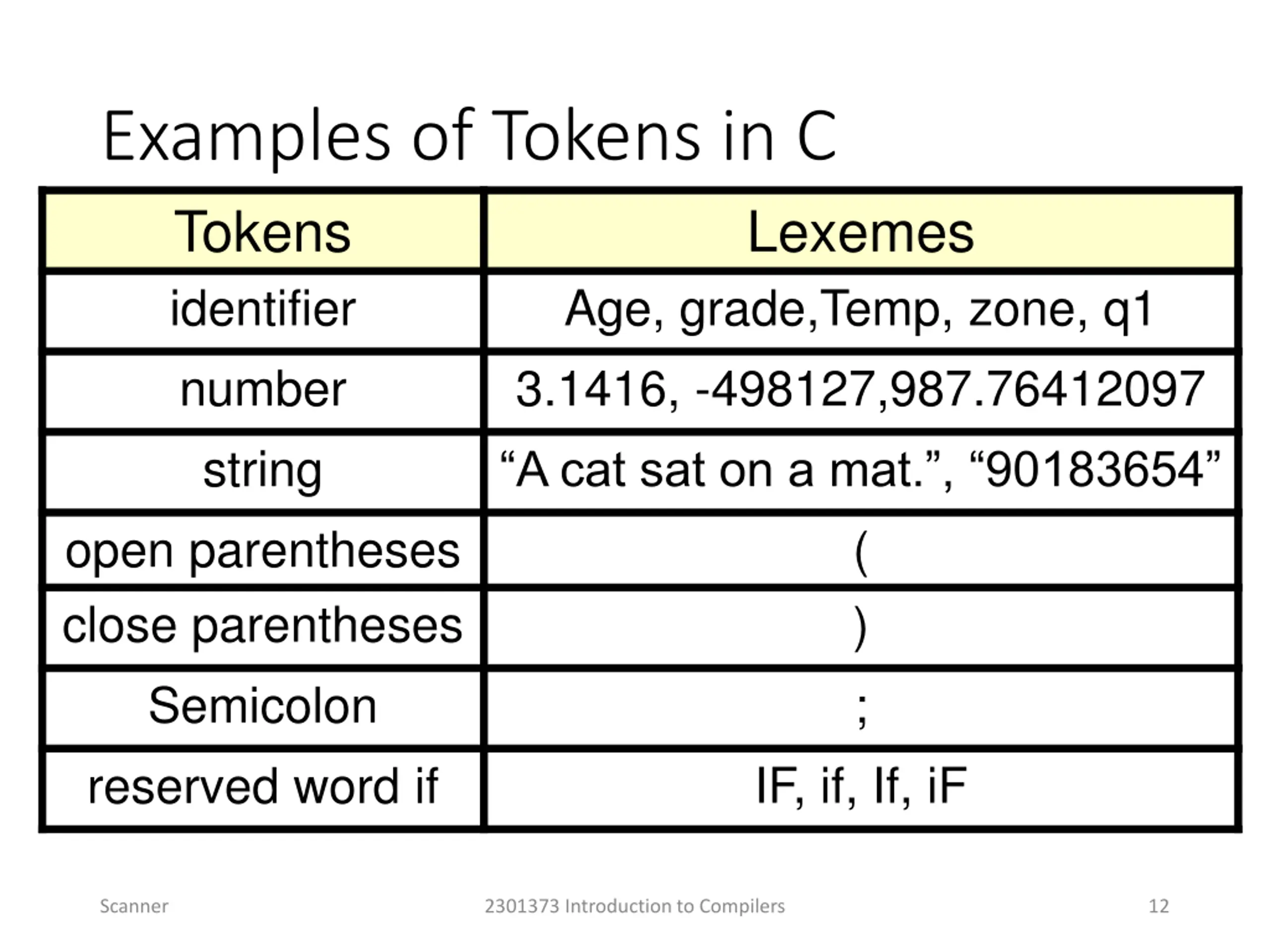 Examples of Tokens in C Tokens identifier number string open parentheses close parentheses Semicolon reserved word if Lexemes Age, grade,Temp, zone, q1 3.1416, -498127,987.76412097 A cat sat on a mat. , 90183654 ( ) ; IF, if, If, iF Scanner 2301373 Introduction to Compilers 12