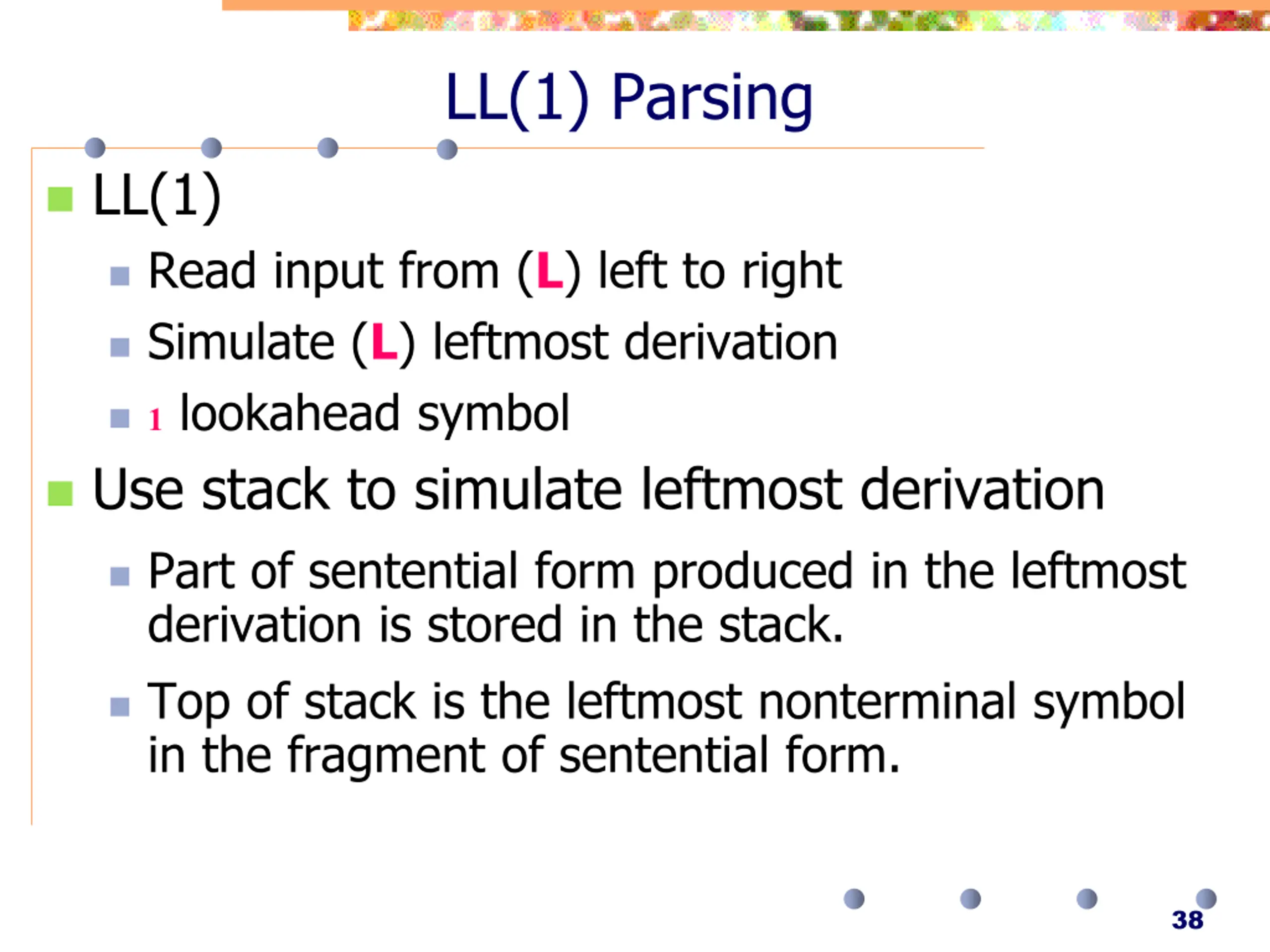 LL(1) Parsing LL(1) Read input from (L) left to right Simulate (L) leftmost derivation 1 lookahead symbol Use stack to simulate leftmost derivation Part of sentential form produced in the leftmost derivation is stored in the stack. Top of stack is the leftmost nonterminal symbol in the fragment of sentential form. 38