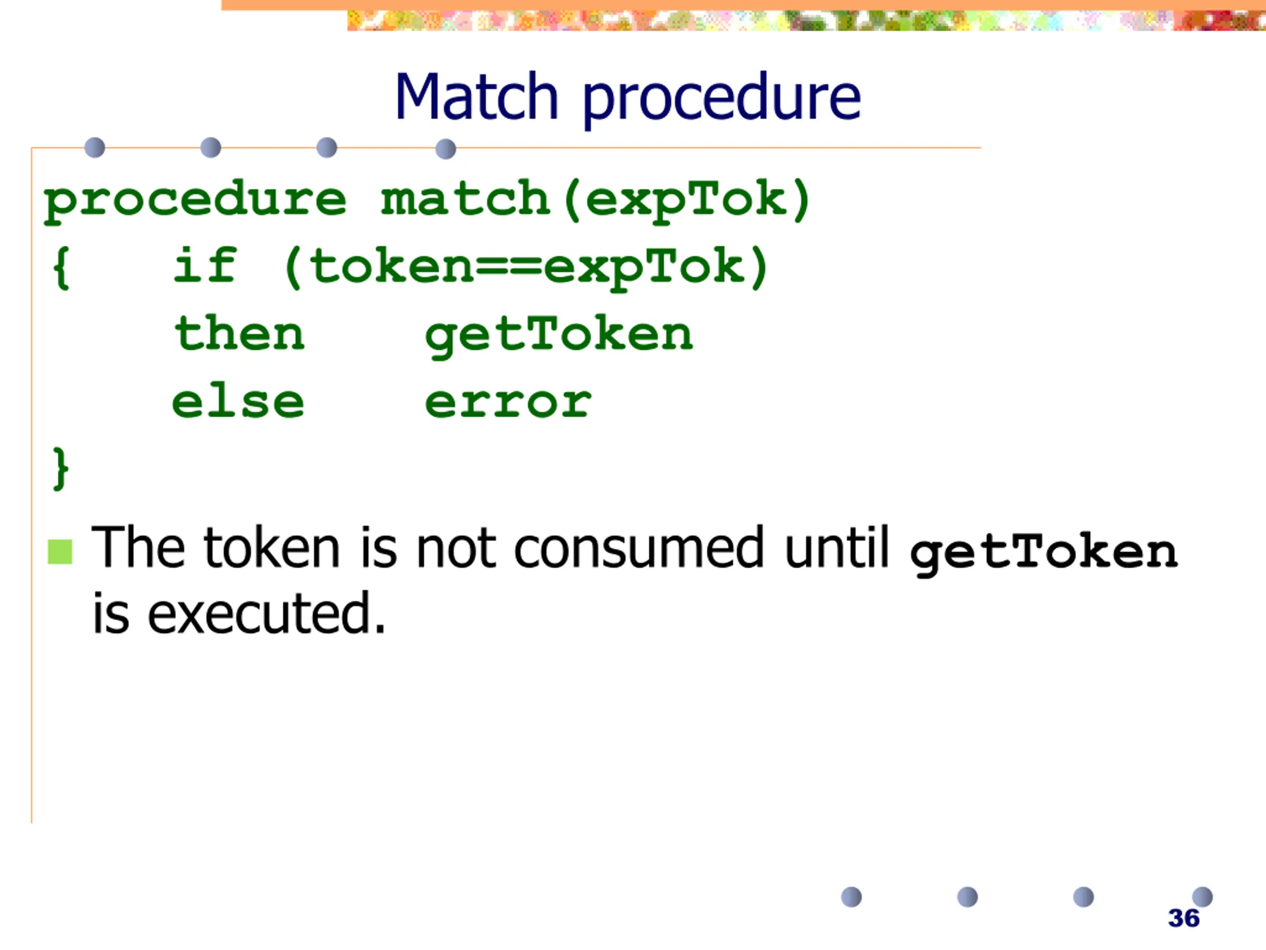 Match procedure procedure match(expTok) { if (token==expTok) then getToken else error } The token is not consumed until getToken is executed. 36