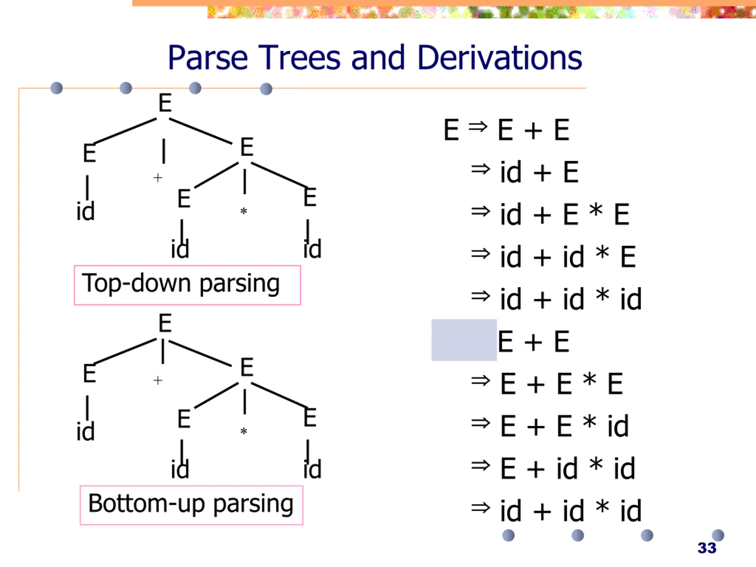 Parse Trees and Derivations E E E + E id + E id + E * E id + id * E id + id * id E E + E * E E + E * id E + id * id id + id * id E E + E E id * id id Top-down parsing E E + E E E + E E id * id id Bottom-up parsing 33