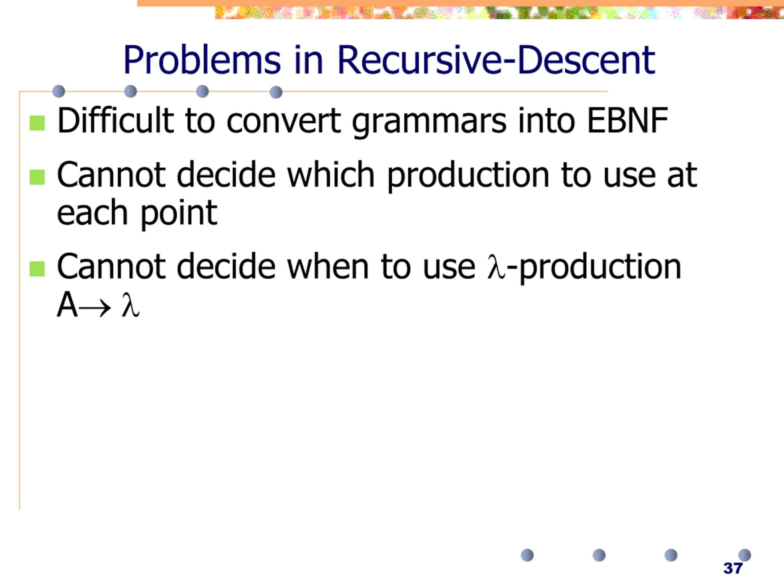 Problems in Recursive-Descent Difficult to convert grammars into EBNF Cannot decide which production to use at each point Cannot decide when to use -production A 37