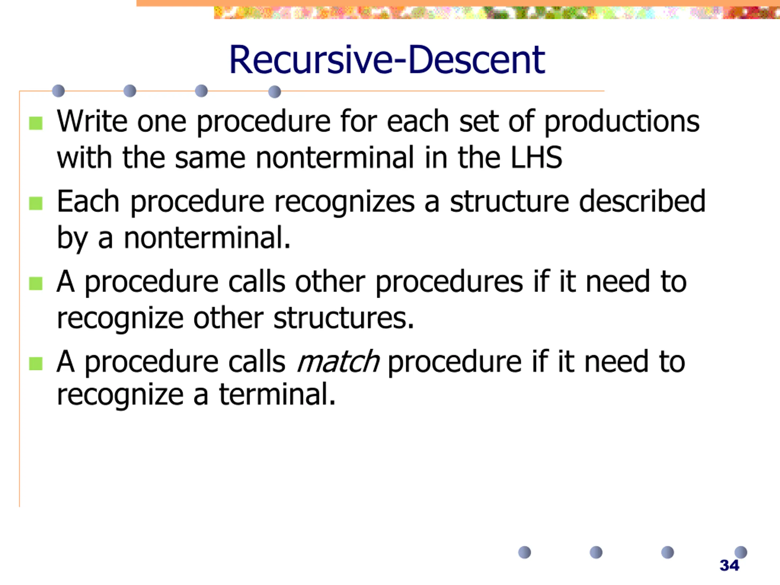 Recursive-Descent Write one procedure for each set of productions with the same nonterminal in the LHS Each procedure recognizes a structure described by a nonterminal. A procedure calls other procedures if it need to recognize other structures. A procedure calls match procedure if it need to recognize a terminal. 34