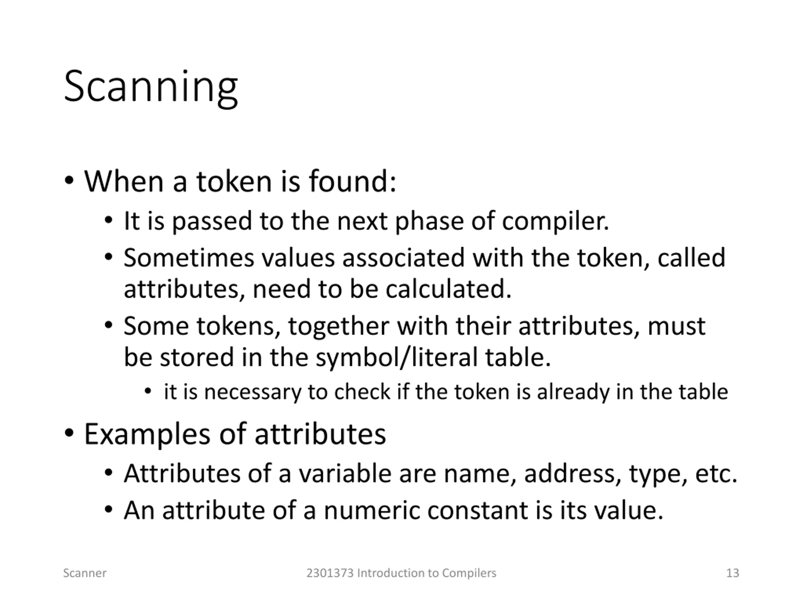 Scanning When a token is found: It is passed to the next phase of compiler. Sometimes values associated with the token, called attributes, need to be calculated. Some tokens, together with their attributes, must be stored in the symbol/literal table. it is necessary to check if the token is already in the table Examples of attributes Attributes of a variable are name, address, type, etc. An attribute of a numeric constant is its value. Scanner 2301373 Introduction to Compilers 13