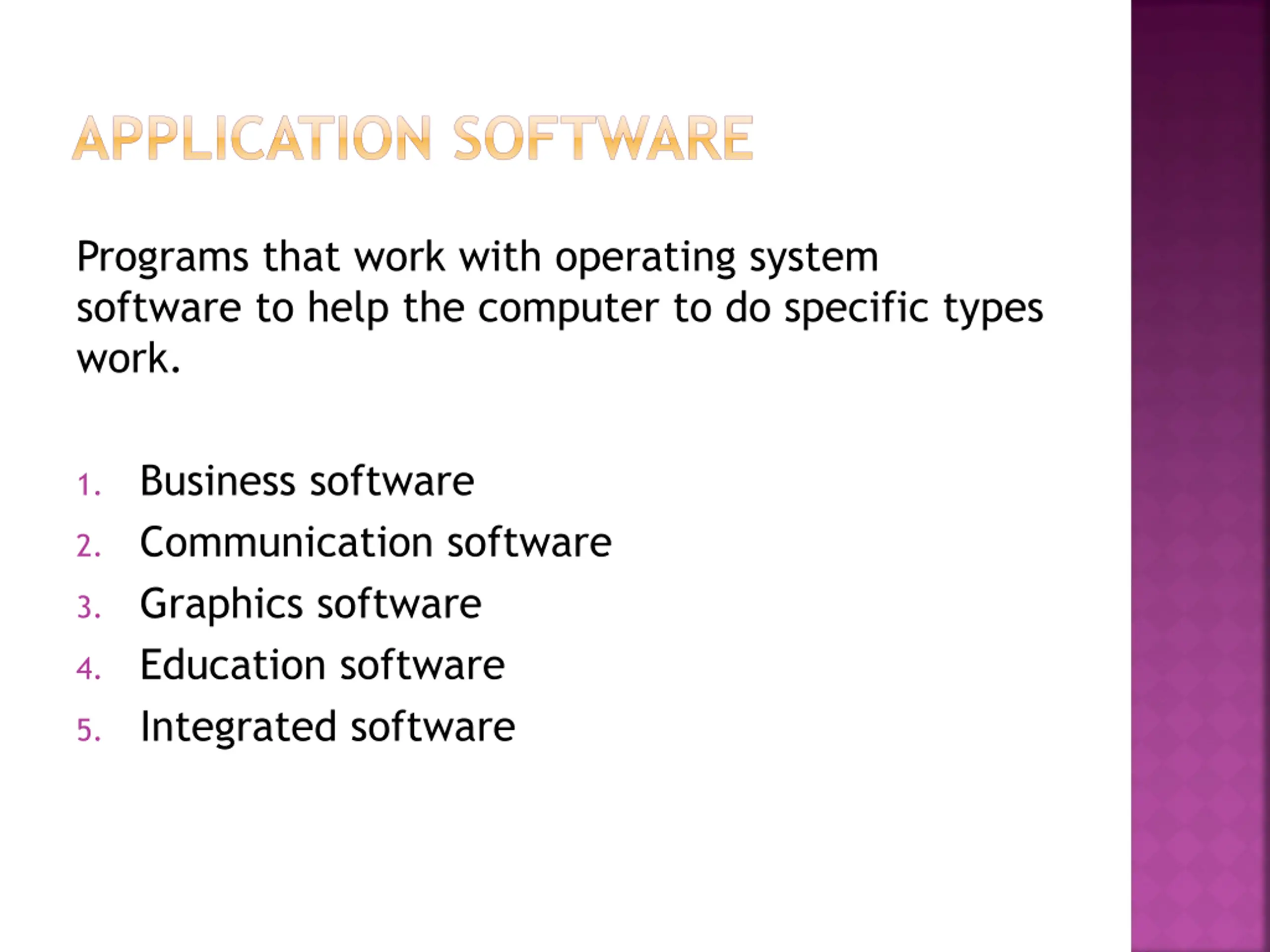 APPLICATION SOFTWARE Programs that work with operating system software to help the computer to do specific types work. 1. Business software 2. Communication software 3. Graphics software 4. Education software 5. Integrated software
