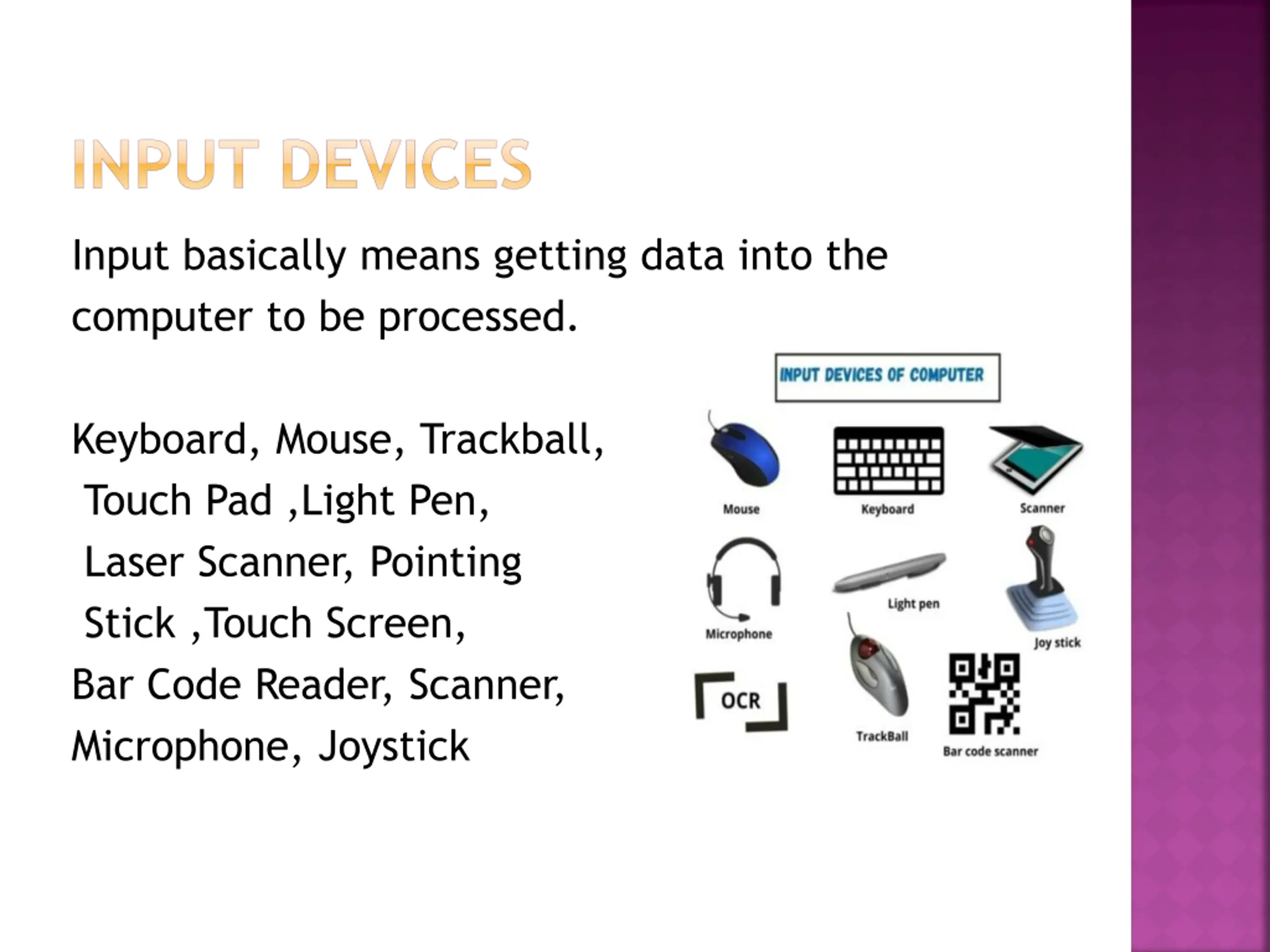 INPUT DEVICES Input basically means getting data into the computer to be processed. Keyboard, Mouse, Trackball, Touch Pad ,Light Pen, Laser Scanner, Pointing Stick ,Touch Screen, Bar Code Reader, Scanner, Microphone, Joystick