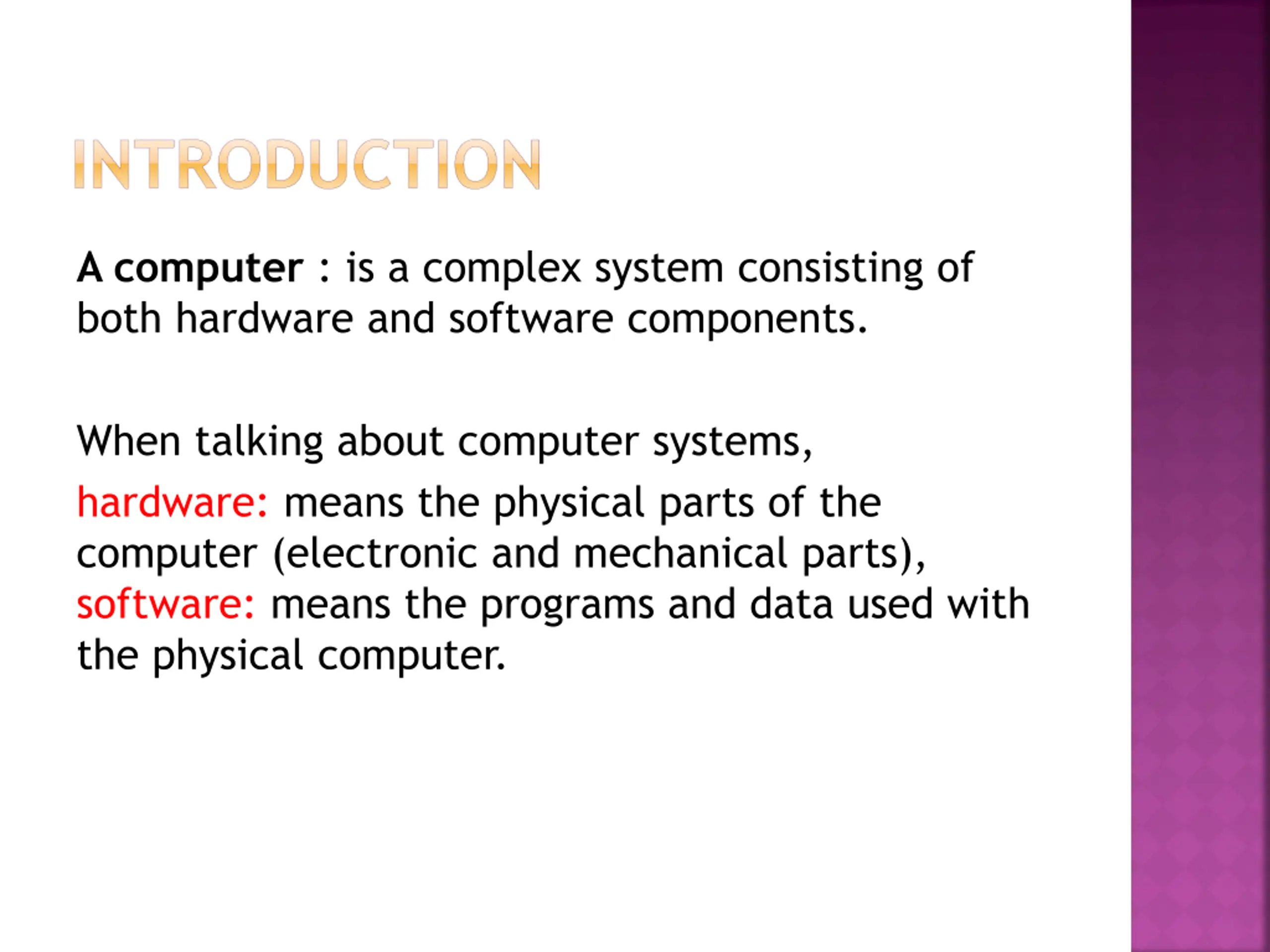 INTRODUCTION A computer : is a complex system consisting of both hardware and software components. When talking about computer systems, hardware: means the physical parts of the computer (electronic and mechanical parts), software: means the programs and data used with the physical computer.