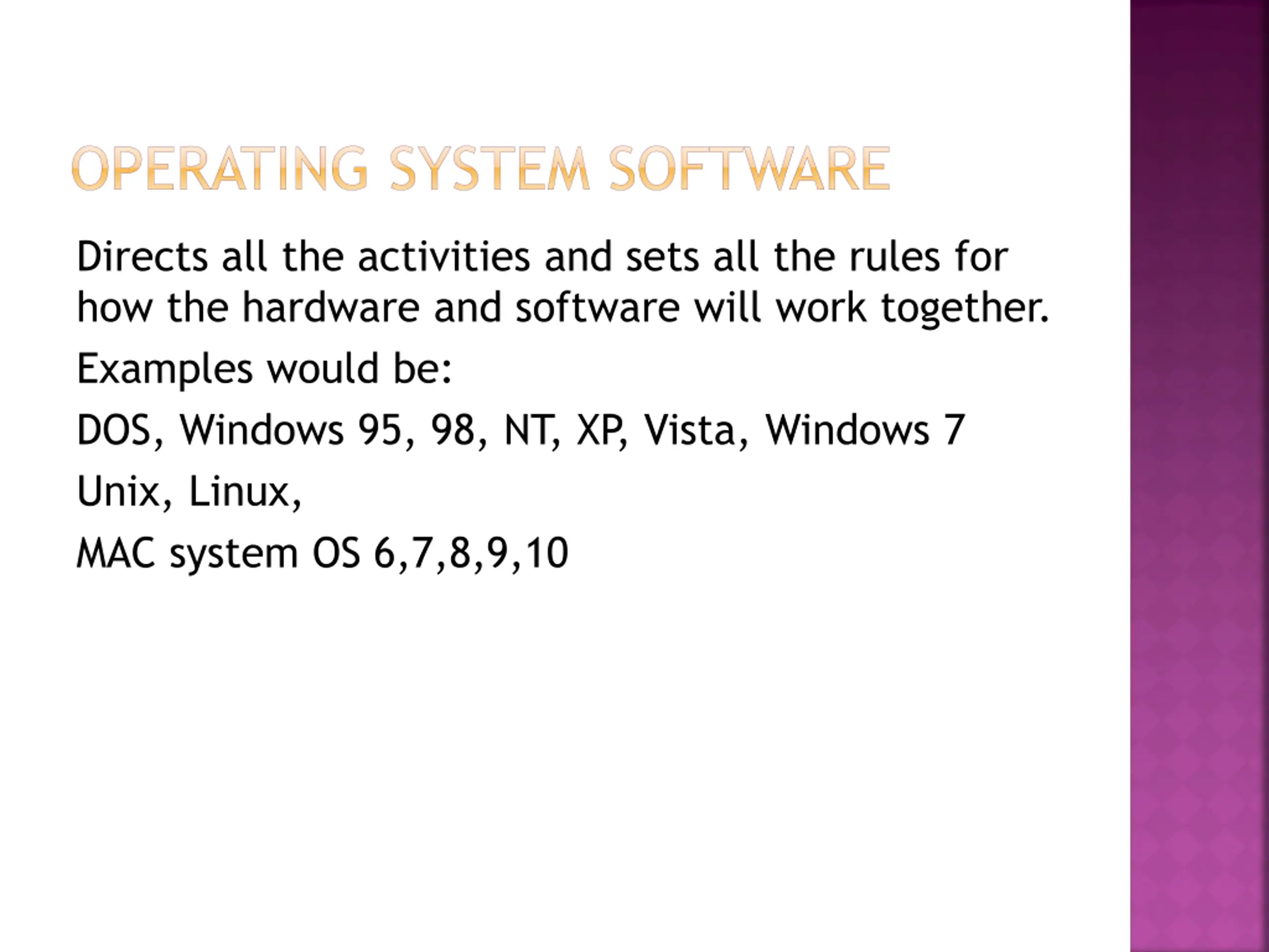 OPERATING SYSTEM SOFTWARE Directs all the activities and sets all the rules for how the hardware and software will work together. Examples would be: DOS, Windows 95, 98, NT, XP, Vista, Windows 7 Unix, Linux, MAC system OS 6,7,8,9,10
