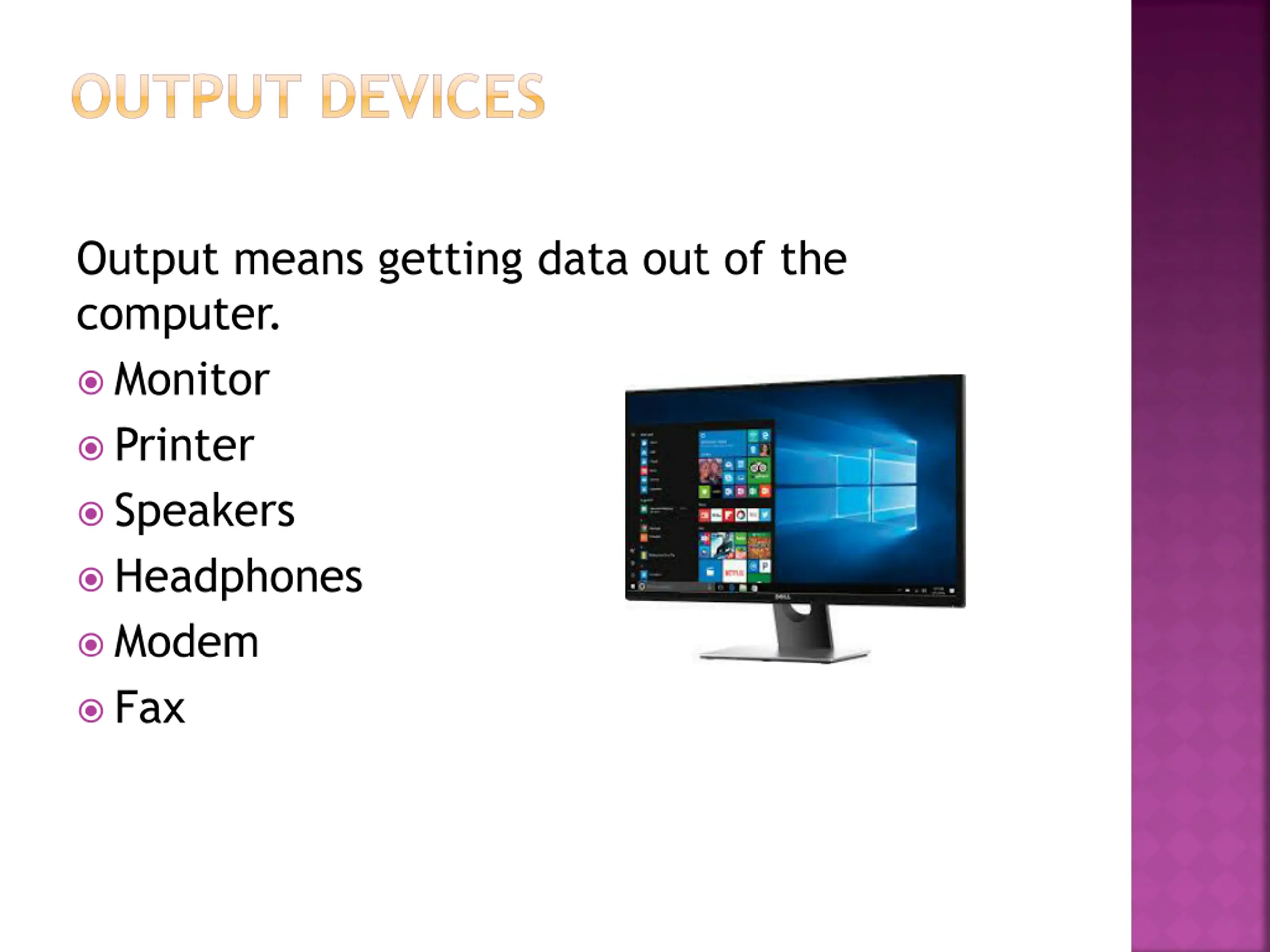 OUTPUT DEVICES Output means getting data out of the computer. Monitor Printer Speakers Headphones Modem Fax