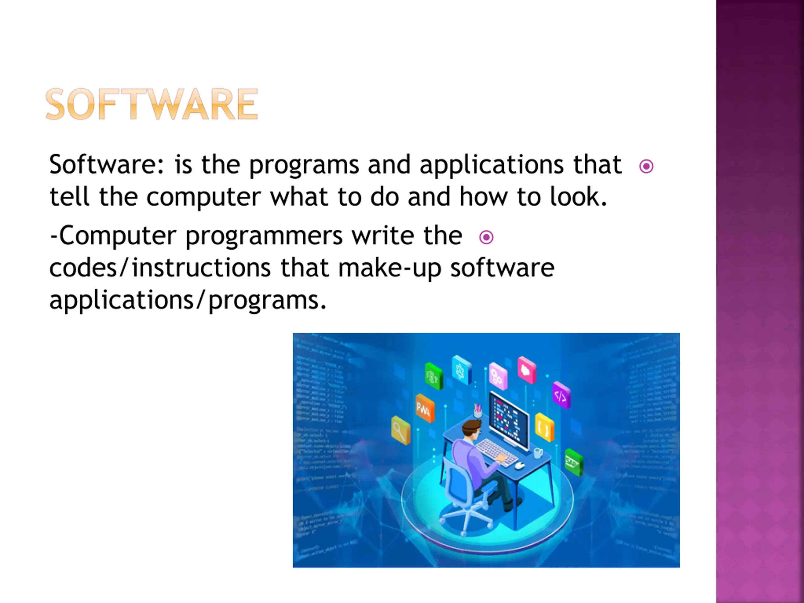 SOFTWARE Software: is the programs and applications that tell the computer what to do and how to look. -Computer programmers write the codes/instructions that make-up software applications/programs.