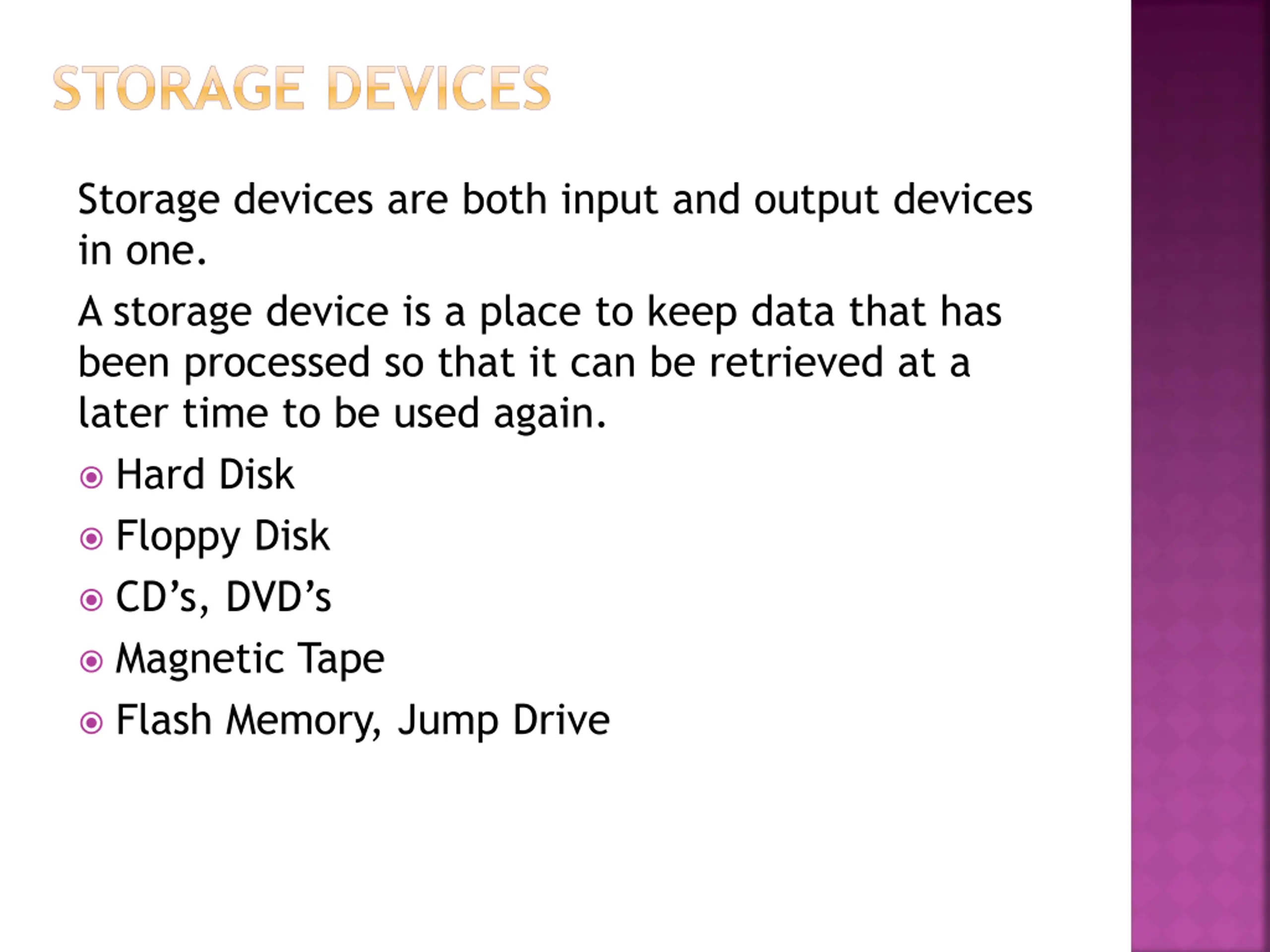 STORAGE DEVICES Storage devices are both input and output devices in one. A storage device is a place to keep data that has been processed so that it can be retrieved at a later time to be used again. Hard Disk Floppy Disk CD s, DVD s Magnetic Tape Flash Memory, Jump Drive