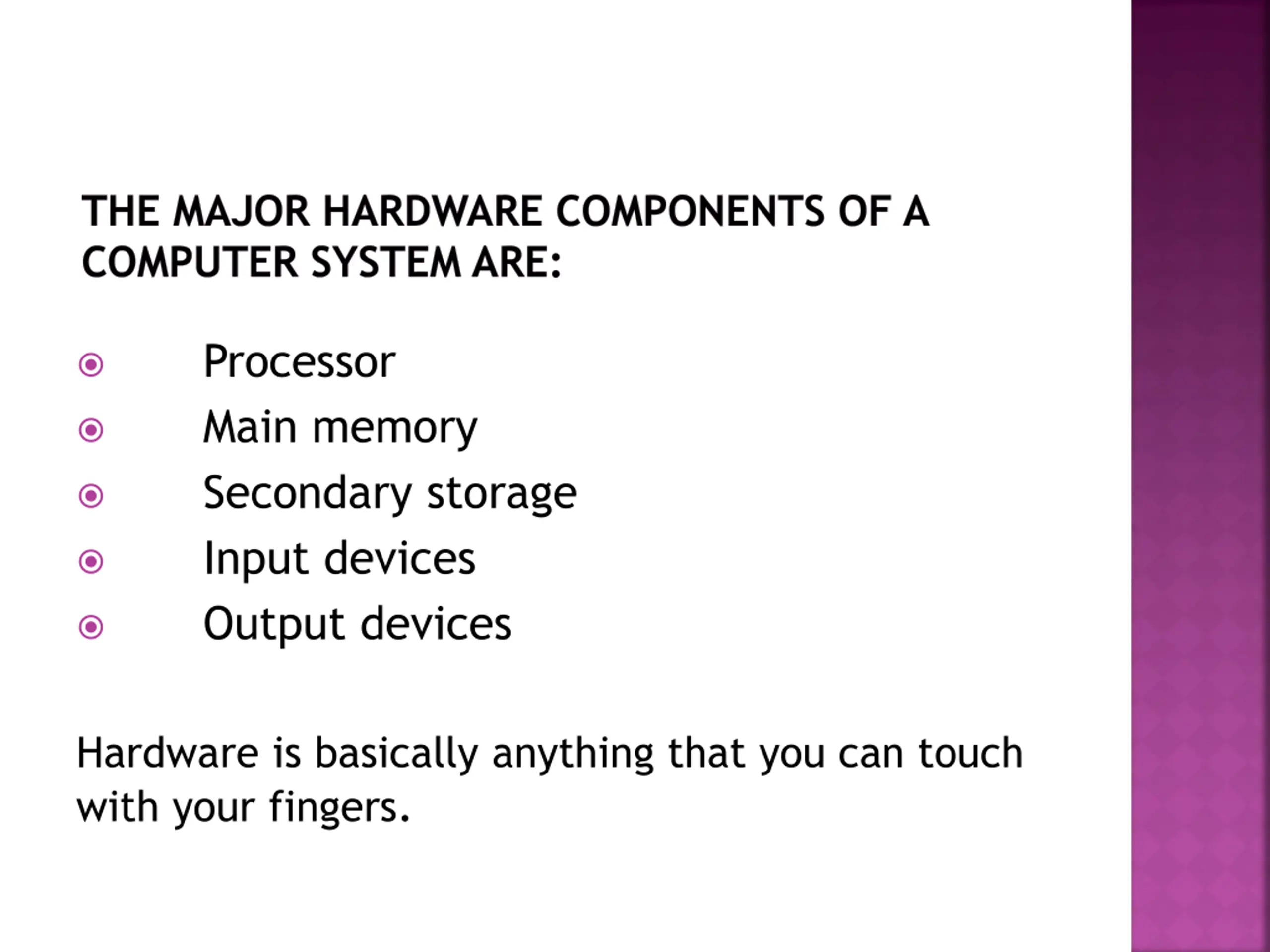 THE MAJOR HARDWARE COMPONENTS OF A COMPUTER SYSTEM ARE: Processor Main memory Secondary storage Input devices Output devices Hardware is basically anything that you can touch with your fingers.