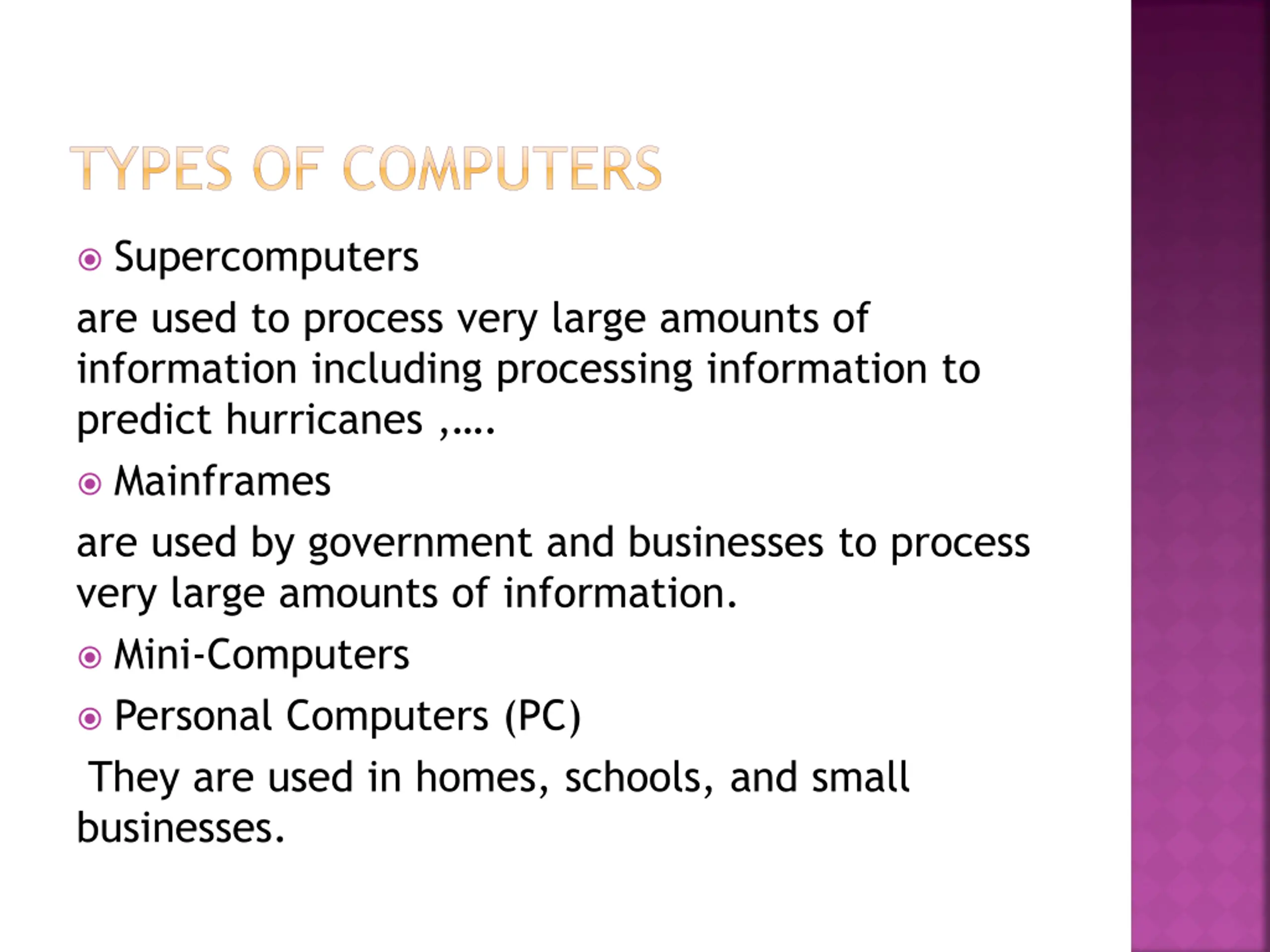 TYPES OF COMPUTERS Supercomputers are used to process very large amounts of information including processing information to predict hurricanes , . Mainframes are used by government and businesses to process very large amounts of information. Mini-Computers Personal Computers (PC) They are used in homes, schools, and small businesses.