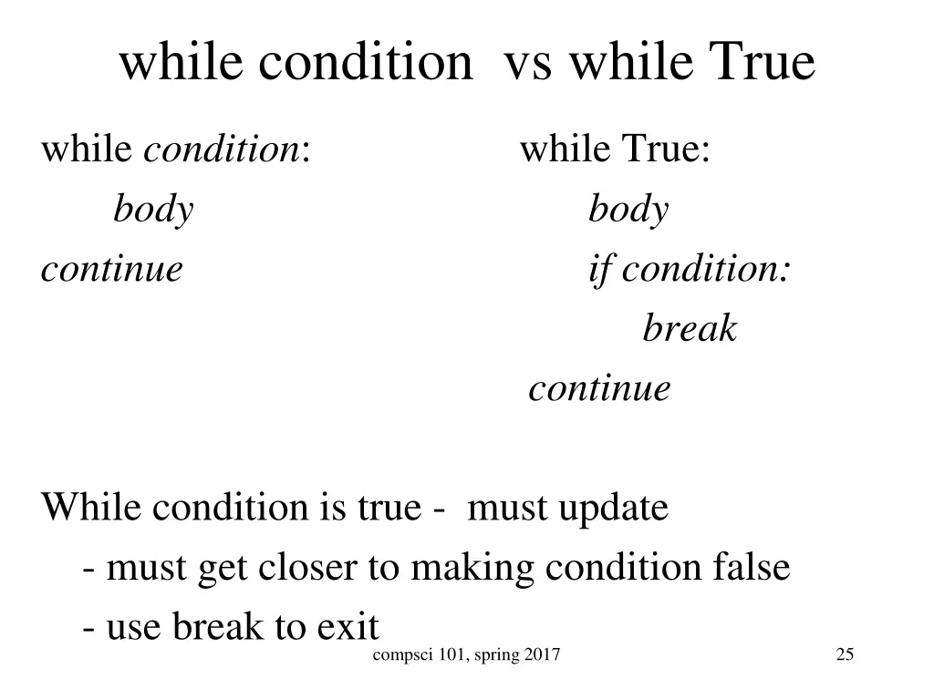 while condition vs while True while condition: while True: body continue if condition: break continue body While condition is true - must update - must get closer to making condition false - use break to exit compsci 101, spring 2017 25