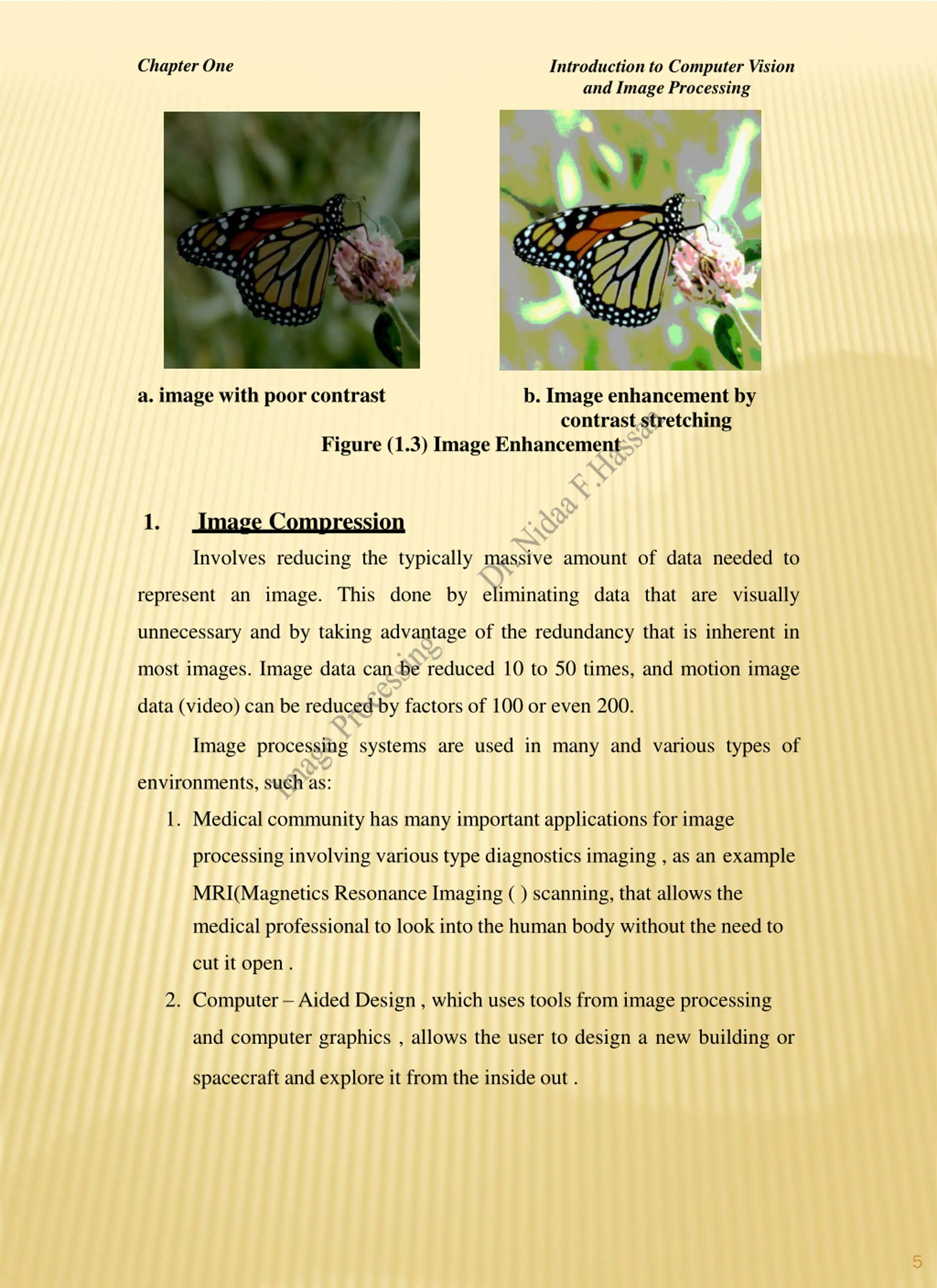 Chapter One Introduction to Computer Vision and Image Processing a. image with poorcontrast b. Image enhancement by contrast stretching Figure (1.3) Image Enhancement Image Compression Involves reducing the typically massive amount of data needed to 1. represent an image. This done by eliminating data that are visually unnecessary and by taking advantage of the redundancy that is inherent in most images. Image data can be reduced 10 to 50 times, and motion image data (video) can be reduced by factors of 100 or even 200. Image processing systems are used in many and various types of environments, such as: 1. Medical community has many important applications for image processing involving various type diagnostics imaging , as an example MRI(Magnetics Resonance Imaging ( ) scanning, that allows the medical professional to look into the human body without the need to cut it open . 2. Computer Aided Design , which uses tools from image processing and computer graphics , allows the user to design a new building or spacecraft and explore it from the inside out . 5
