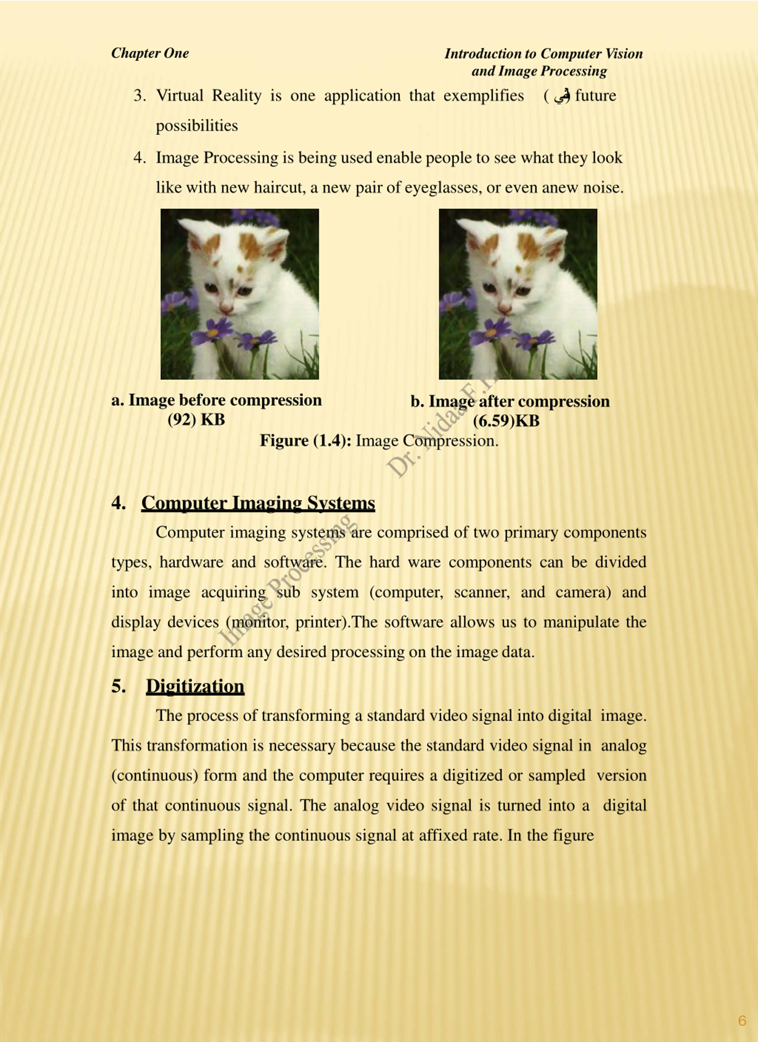 Chapter One Introduction to Computer Vision and Image Processing ( ) future 3. Virtual Reality is one application that exemplifies possibilities 4. Image Processing is being used enable people to see what they look like with new haircut, a new pair of eyeglasses, or even anew noise. a. Image before compression (92) KB b. Image after compression (6.59)KB Figure (1.4): Image Compression. 4. Computer Imaging Systems Computer imaging systems are comprised of two primary components types, hardware and software. The hard ware components can be divided into image acquiring sub system (computer, scanner, and camera) and display devices (monitor, printer).The software allows us to manipulate the image and perform any desired processing on the imagedata. 5. Digitization The process of transforming a standard video signal into digital image. This transformation is necessary because the standard video signal in analog (continuous) form and the computer requires a digitized or sampled version of that continuous signal. The analog video signal is turned into a digital image by sampling the continuous signal at affixed rate. In the figure 6
