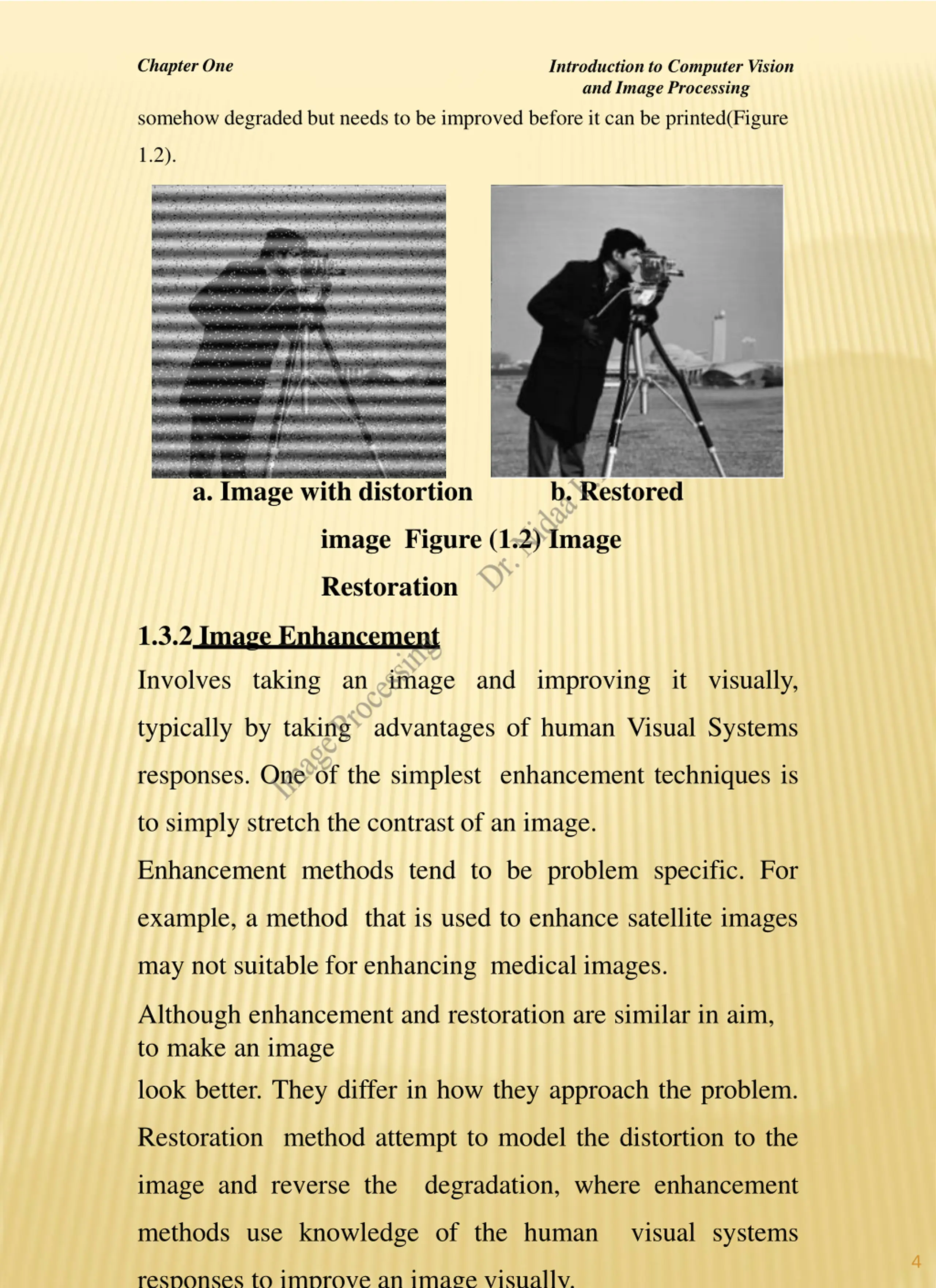 Chapter One Introduction to Computer Vision and Image Processing somehow degraded but needs to be improved before it can be printed(Figure 1.2). a. Image with distortion b. Restored image Figure (1.2) Image Restoration 1.3.2 Image Enhancement Involves taking an image and improving it visually, typically by taking advantages of human Visual Systems responses. One of the simplest enhancement techniques is to simply stretch the contrast of an image. Enhancement methods tend to be problem specific. For example, a method that is used to enhance satellite images may not suitable for enhancing medical images. Although enhancement and restoration are similar in aim, to make an image look better. They differ in how they approach the problem. Restoration method attempt to model the distortion to the image and reverse the degradation, where enhancement methods use knowledge of the human visual systems 4 responses to improve an image visually.
