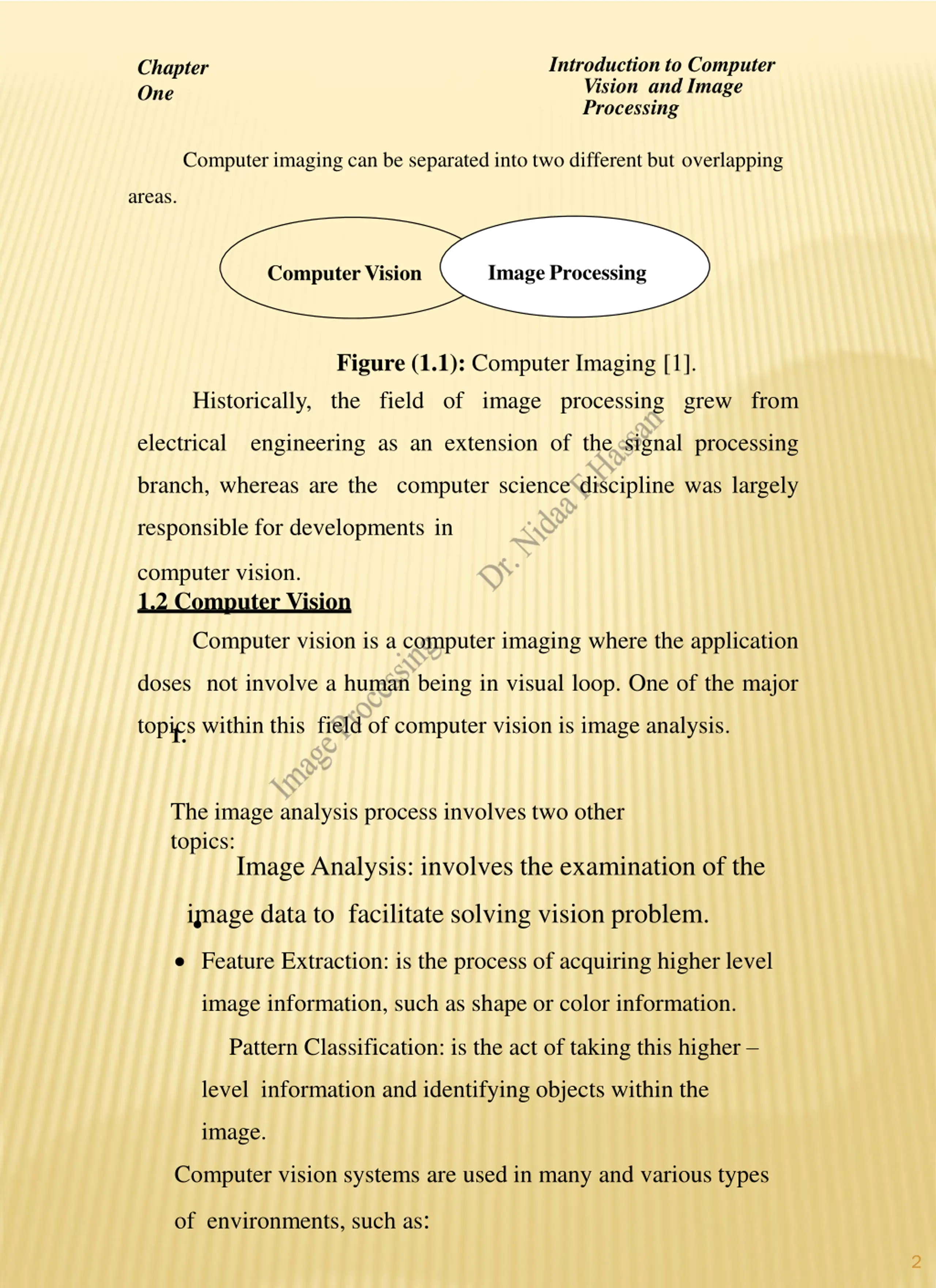 Introduction to Computer Vision and Image Processing Chapter One Computer imaging can be separated into two different but overlapping areas. Image Processing ComputerVision Figure (1.1): Computer Imaging [1]. Historically, the field of image processing grew from electrical engineering as an extension of the signal processing branch, whereas are the computer science discipline was largely responsible for developments in computer vision. 1.2 Computer Vision Computer vision is a computer imaging where the application doses not involve a human being in visual loop. One of the major topics within this field of computer vision is image analysis. 1. The image analysis process involves two other topics: Image Analysis: involves the examination of the image data to facilitate solving vision problem. Feature Extraction: is the process of acquiring higher level image information, such as shape or color information. Pattern Classification: is the act of taking this higher level information and identifying objects within the image. Computer vision systems are used in many and various types of environments, such as: 2