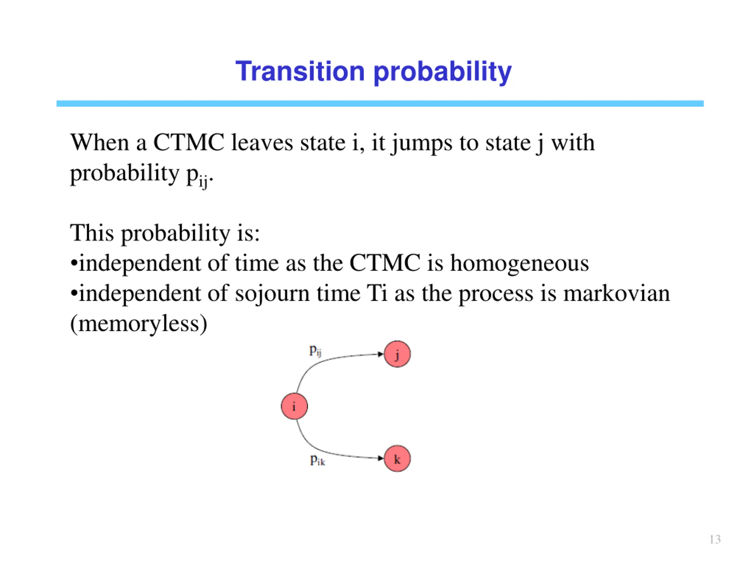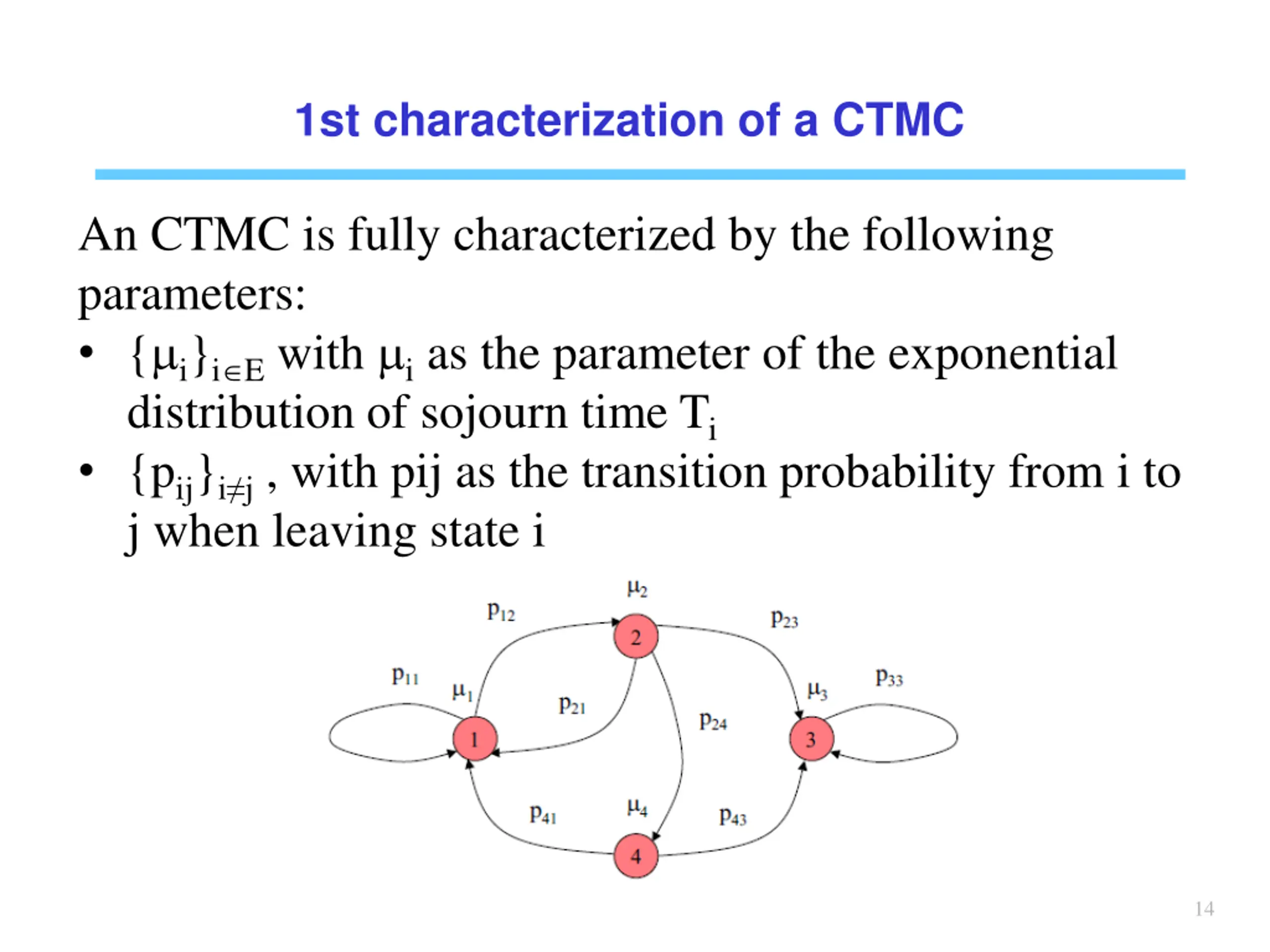 Transition probability When a CTMC leaves state i, it jumps to state j with probability pij. This probability is: independent of time as the CTMC is homogeneous independent of sojourn time Ti as the process is markovian (memoryless) 13