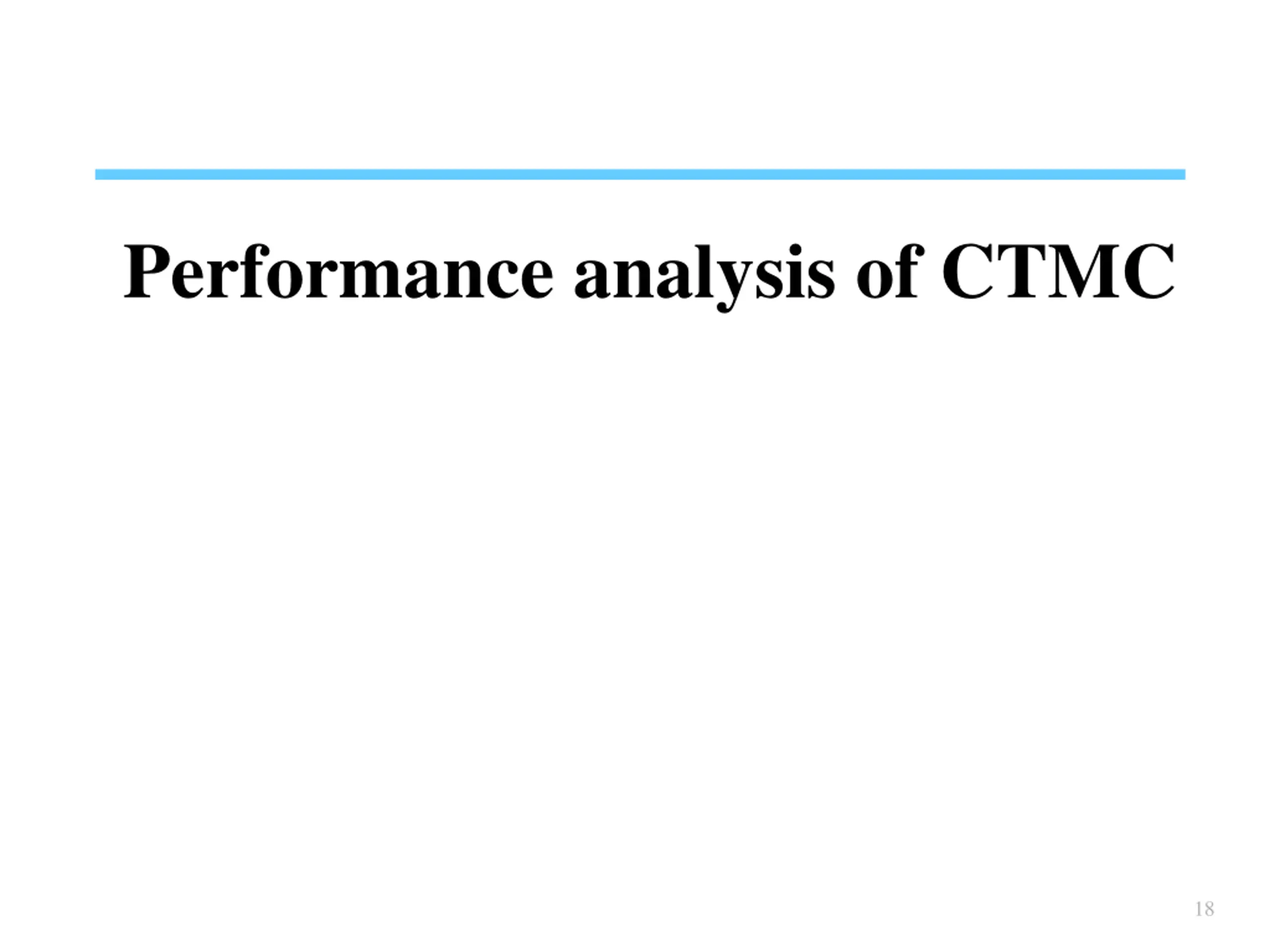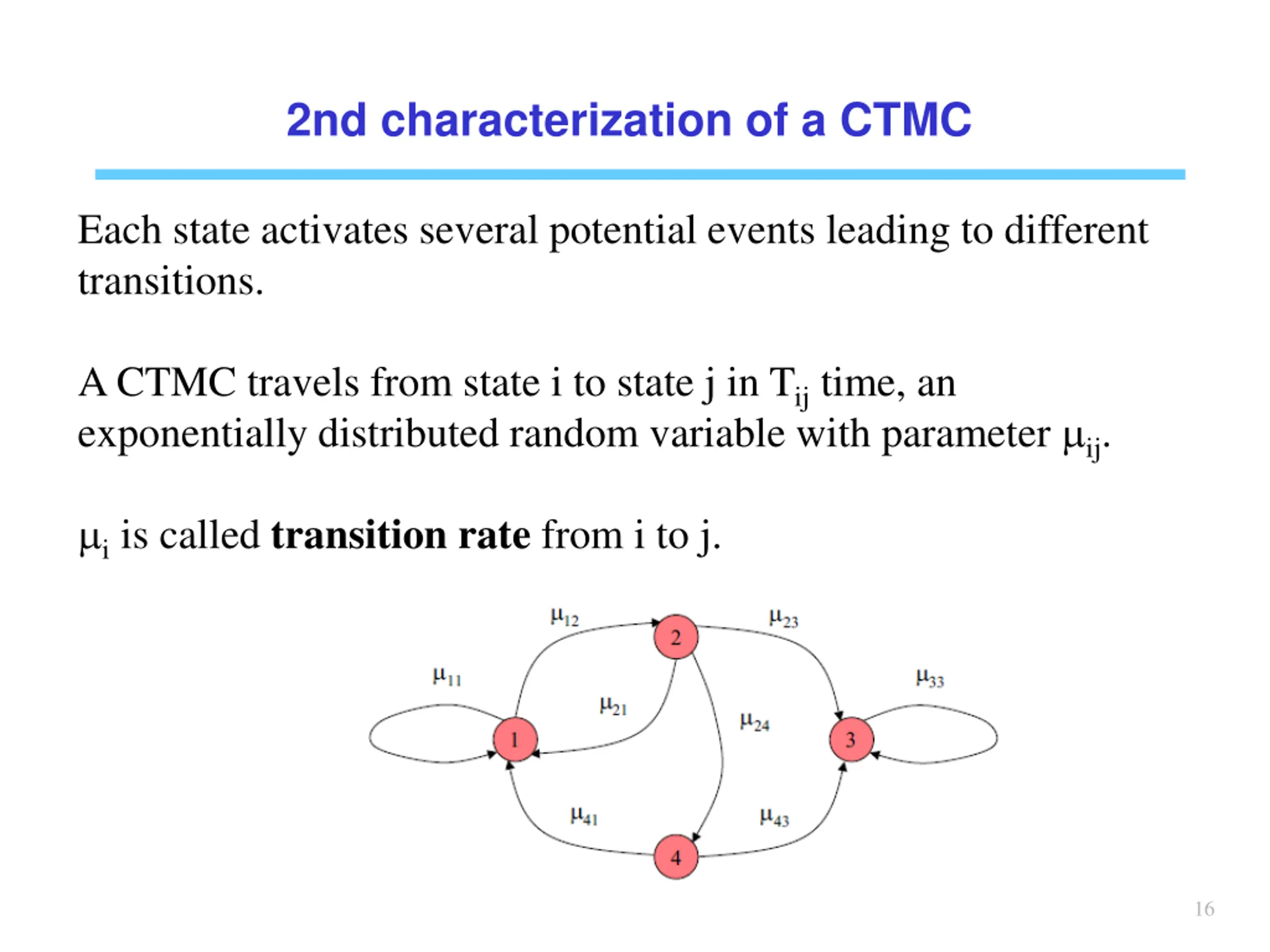 2nd characterization of a CTMC Each state activates several potential events leading to different transitions. A CTMC travels from state i to state j in Tijtime, an exponentially distributed random variable with parameter ij. iis called transition rate from i to j. 16