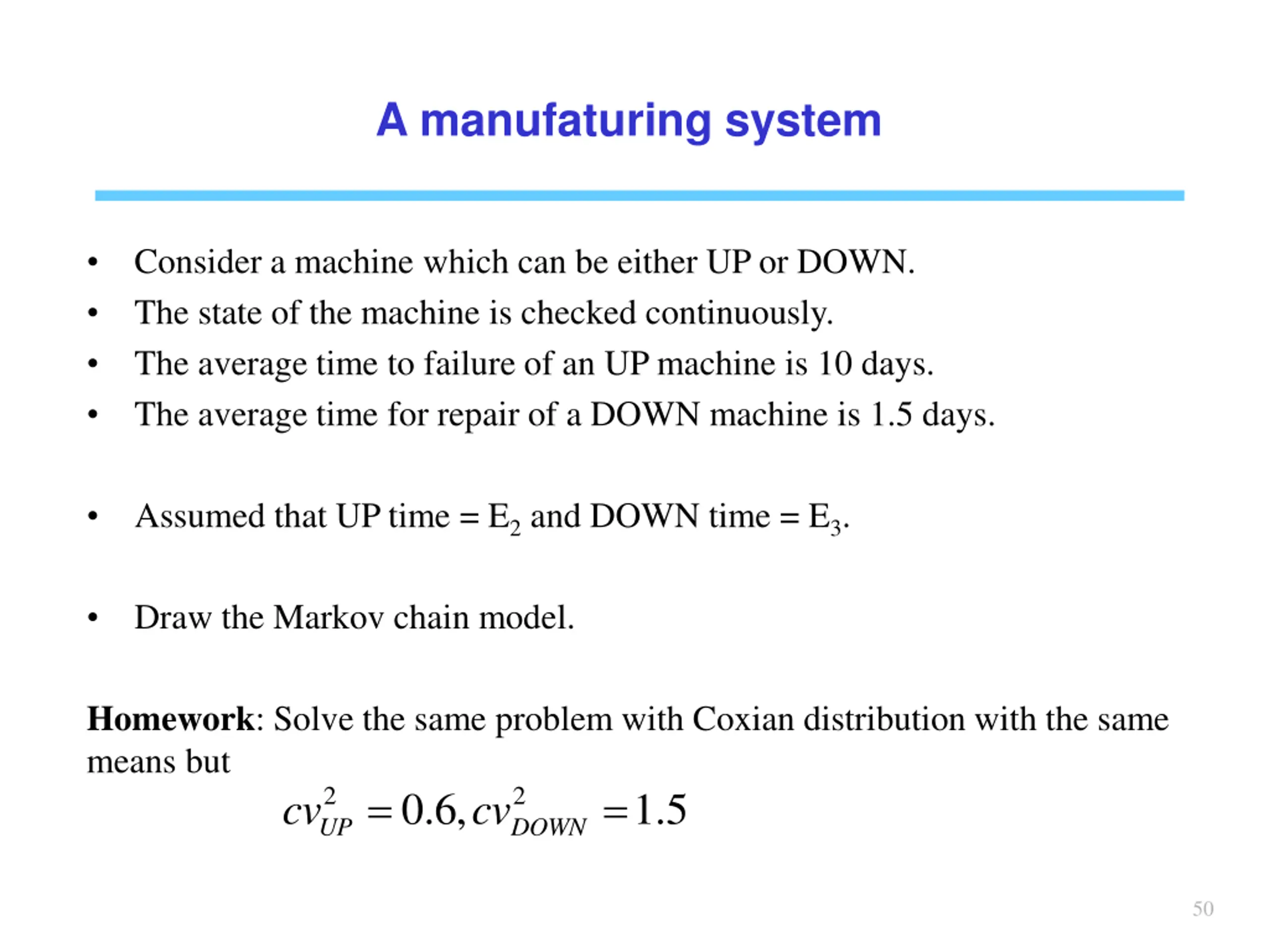 A manufaturing system Consider a machine which can be either UP or DOWN. The state of the machine is checked continuously. The average time to failure of an UP machine is 10 days. The average time for repair of a DOWN machine is 1.5 days. Assumed that UP time = E2and DOWN time = E3. Draw the Markov chain model. Homework: Solve the same problem with Coxian distribution with the same means but 2 2 0.6, UP DOWN cv cv = = 1.5 50