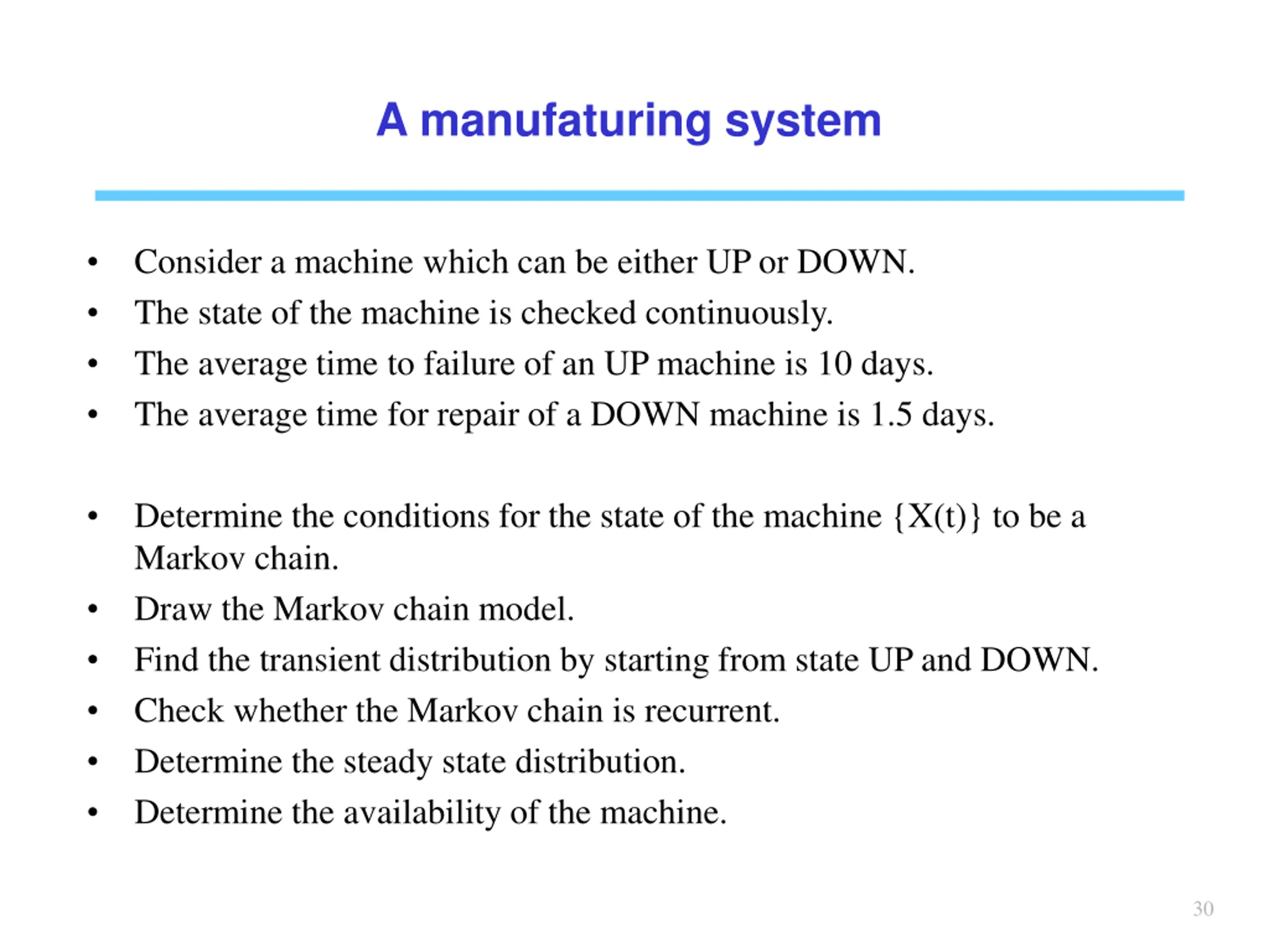 A manufaturing system Consider a machine which can be either UP or DOWN. The state of the machine is checked continuously. The average time to failure of an UP machine is 10 days. The average time for repair of a DOWN machine is 1.5 days. Determine the conditions for the state of the machine {X(t)} to be a Markov chain. Draw the Markov chain model. Find the transient distribution by starting from state UP and DOWN. Check whether the Markov chain is recurrent. Determine the steady state distribution. Determine the availability of the machine. 30