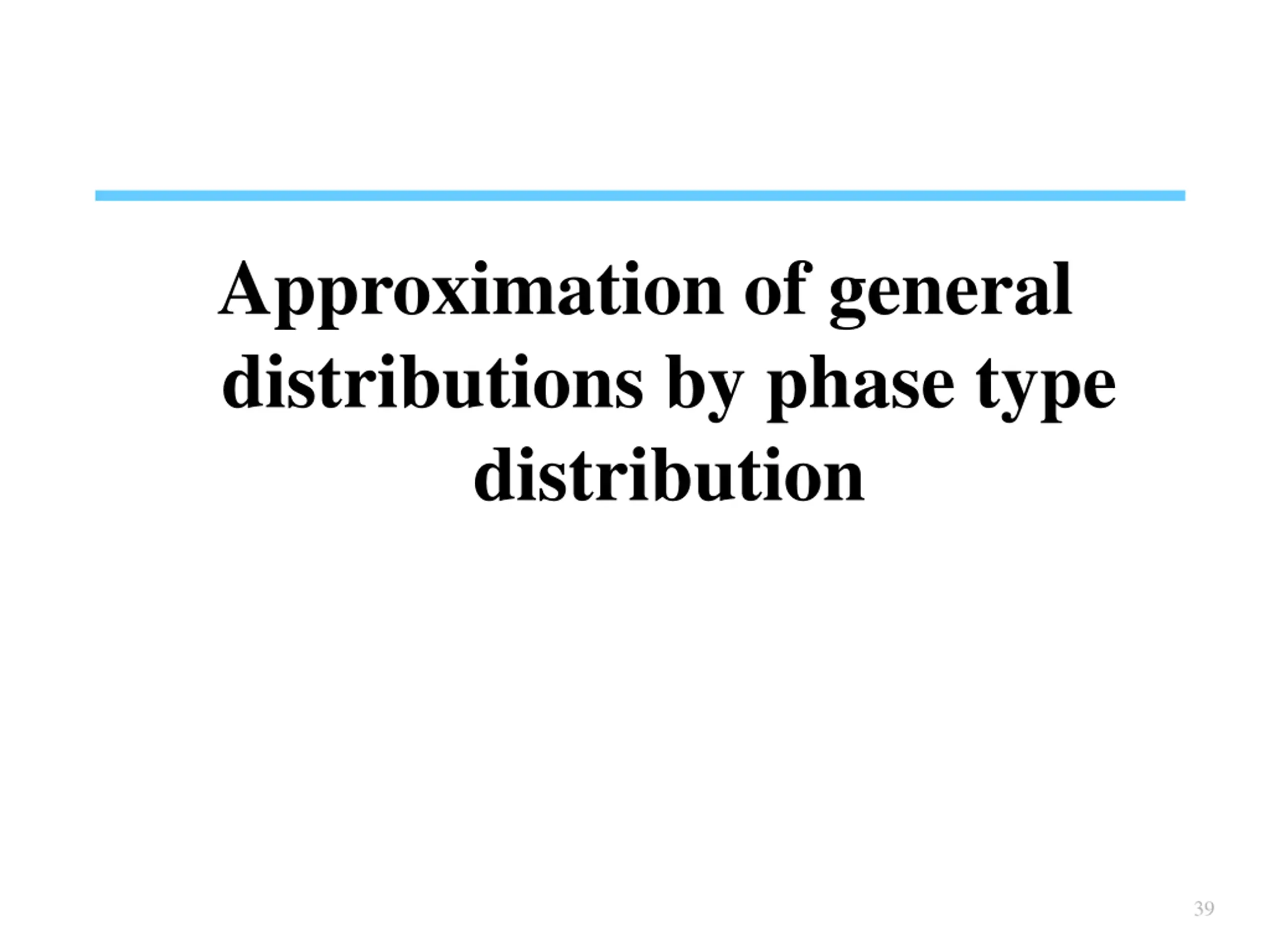 Phase-type distribution A probability distribution that results from a system of one or more inter-related Poisson process occurring in sequence, or phases. The sequence in which each of the phases occur may itself be a stochastic process. Phase-type distribution = time until the absorption of a CTMC one absorbing state and m transient states. Each of the states of the Markov process represents one of the phases. Phase-type distributions can be used to approximate any positive valued distribution. 43