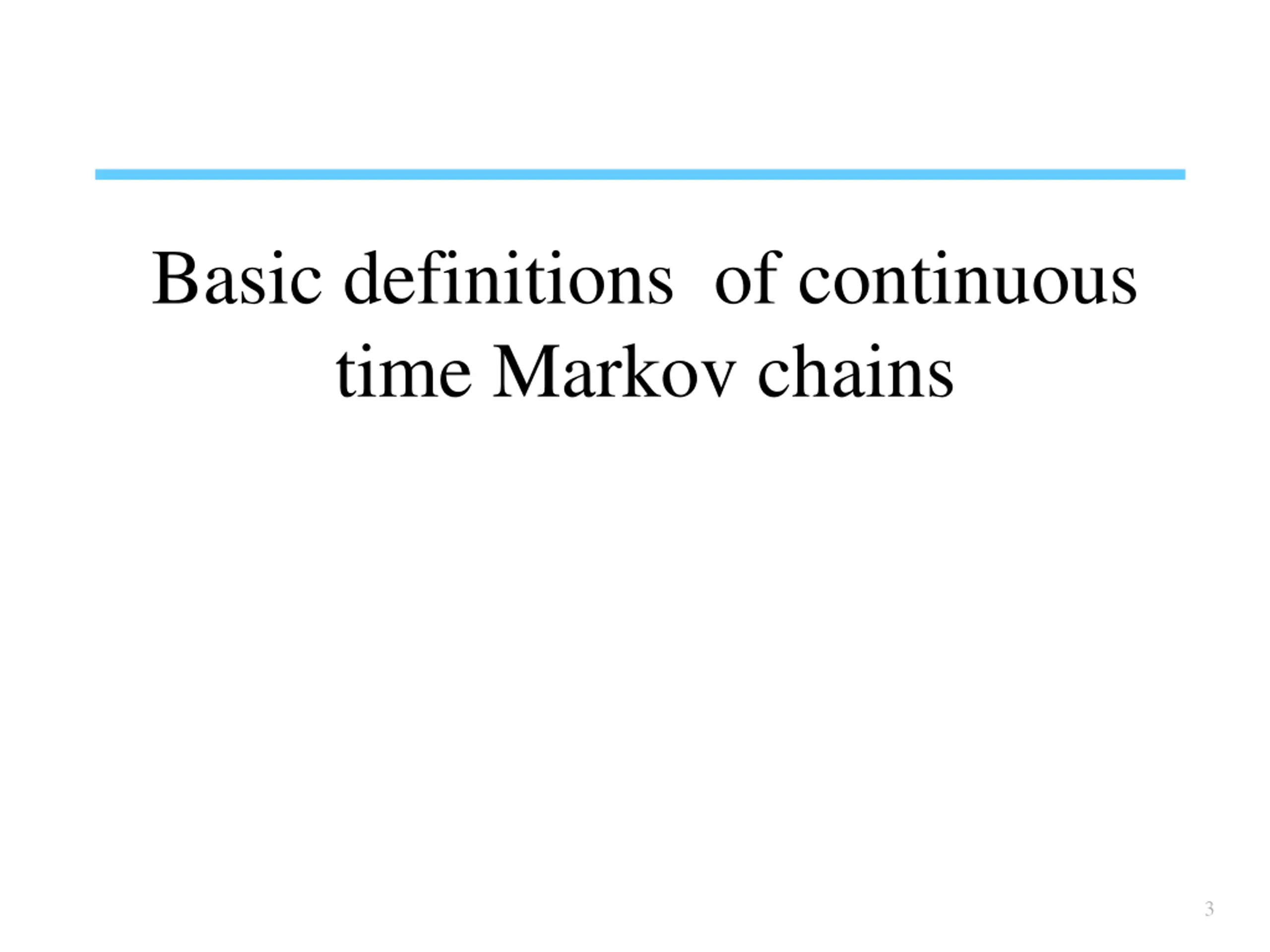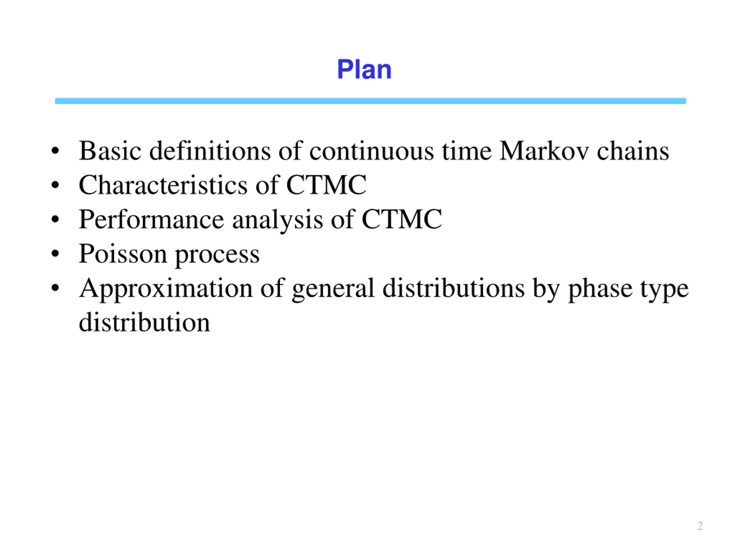 Plan Basic definitions of continuous time Markov chains Characteristics of CTMC Performance analysis of CTMC Poisson process Approximation of general distributions by phase type distribution 2